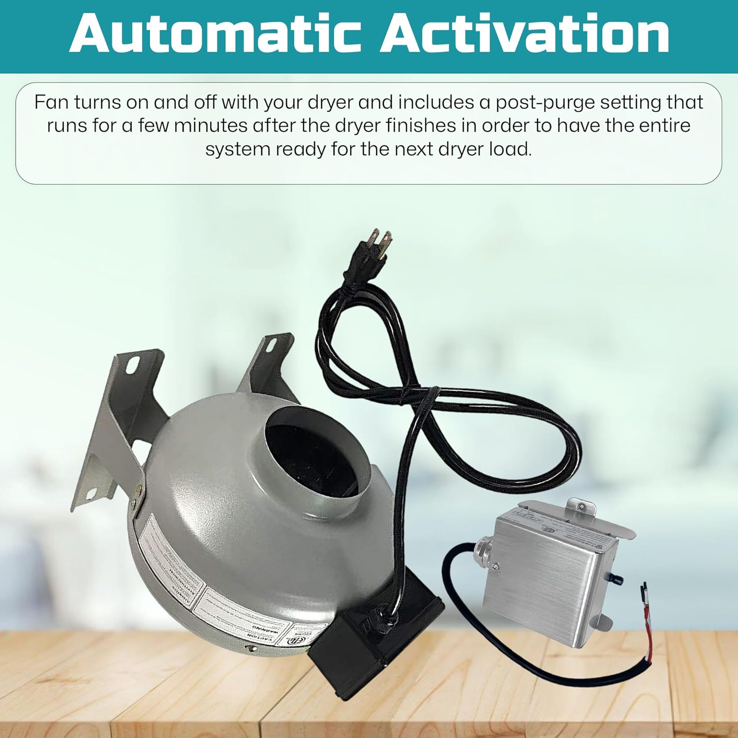 Automatic Activation: The M-4DBT offers hassle-free operation thanks to its automatic activation feature. The fan turns on and off in sync with your dryer based on pressure requiring no manual intervention. In addition it includes a post-purge setting which keeps the fan running for a few minutes after the dryer cycle finishes. This ensures that any residual lint is completely cleared from the ductwork preparing the system for the next load.