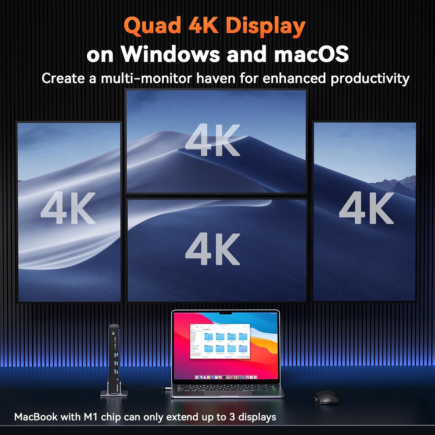 Quad Display: The upgraded displaylink 4 monitor docking station features 4 HDMI and 4 DP ports allowing both Windows laptops and MacBooks to connect to 4 external monitors (Note: M1 chip MacBooks can only extend to 3 monitors). All monitors deliver a stunning 4K@60Hz resolution providing a seamless multitasking experience