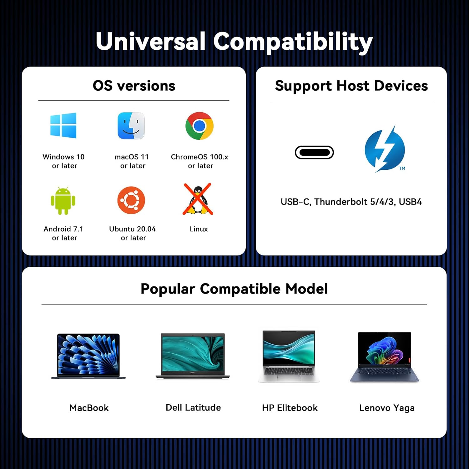Universal Compatibility: The DisplayLink thunderbolt 4 docking station works seamlessly with Windows laptops (Windows 10+) MacBooks Mac Minis and Android systems. Supports Thunderbolt 3 Thunderbolt 4 Thunderbolt 5 USB4 and USB-C ports. Also compatible with Chrome OS 100+ macOS 11+ and Ubuntu systems. DON'T support Linux/Unix. Note: Need to install the Displaylink driver before use and HDCP is not supported