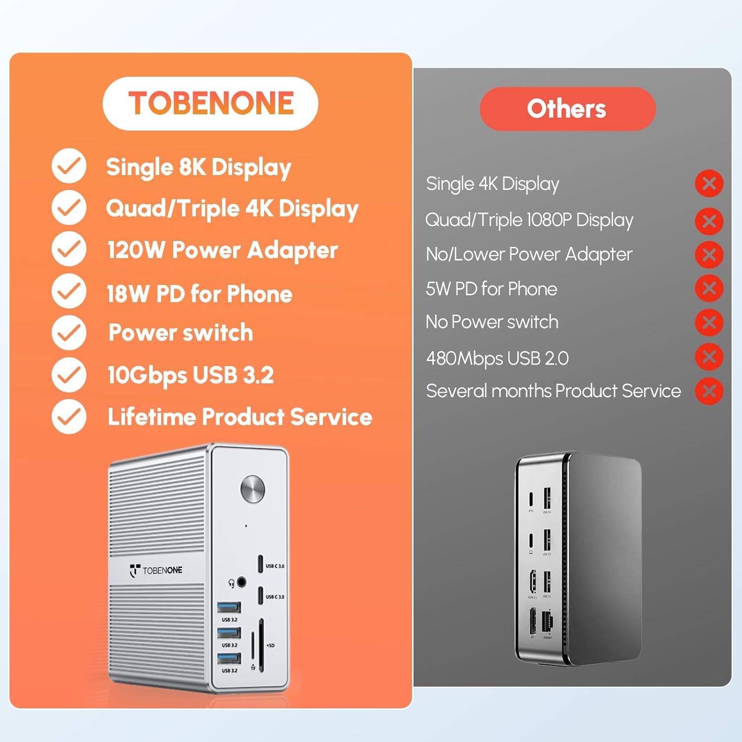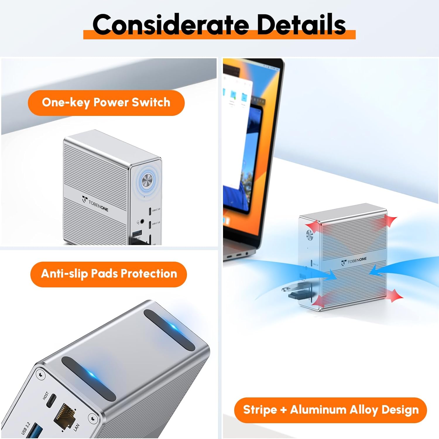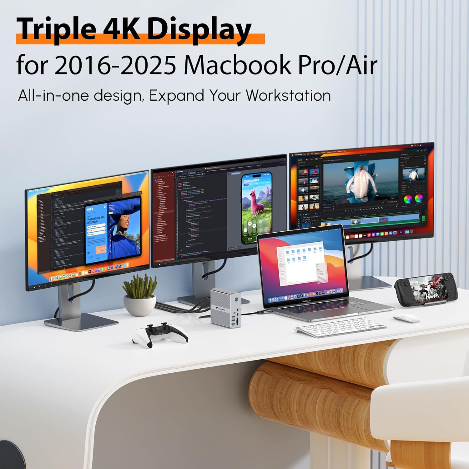 Triple/Quad 4K Extended Display: Featuring 3x HDMI and 3x DP this docking station allows you to enjoy various display combinations(HDMI DP or a mix) to effortlessly extend your laptop to triple/quad 4K@60Hz monitors providing a stunning visual experience. Ideal for stock trading (multi-screen monitoring) OBS content creation video production and software development.Note: For Windows it support up to 4 monitors if laptop's USB-C port support video outpu; macOS support only 3 monitors