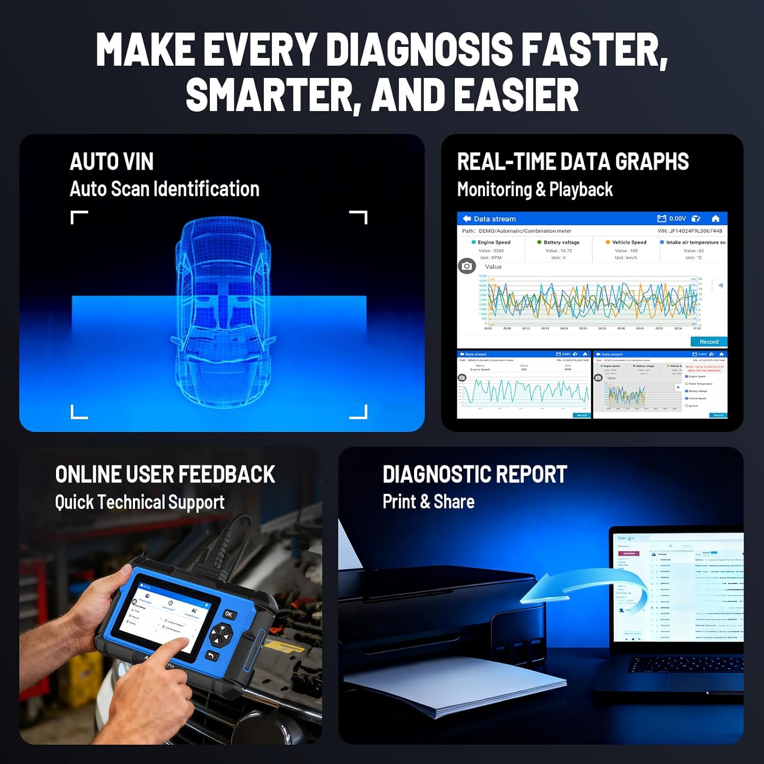 [Advanced AutoVIN AutoScan & ECU Identification] - This code reader is equipped with intelligent AutoVIN technology that automatically detects the vehicles VIN eliminating the need for manual entry. With AutoScan and ECU Identification it quickly scans all vehicle systems and retrieves fault codes helping speed up diagnostics and identify faulty systems. These smart features simplify the initial setup while improving accuracy and overall efficiency. Note: Funtion doesnt work on All cars.