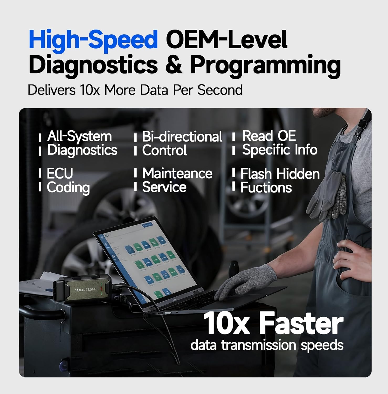 High-Speed OEM-Level Diagnostics & Programming: Unlock true OEM functionality with comprehensive system diagnostics guided troubleshooting coding adaptations resets and programmingall designed to slash repair time. This all-in-one tool eliminates the need for multiple OEM devices boosting efficiency and cutting costs. Equipped with High-Speed USB it delivers 10x more data per second than competing solutions