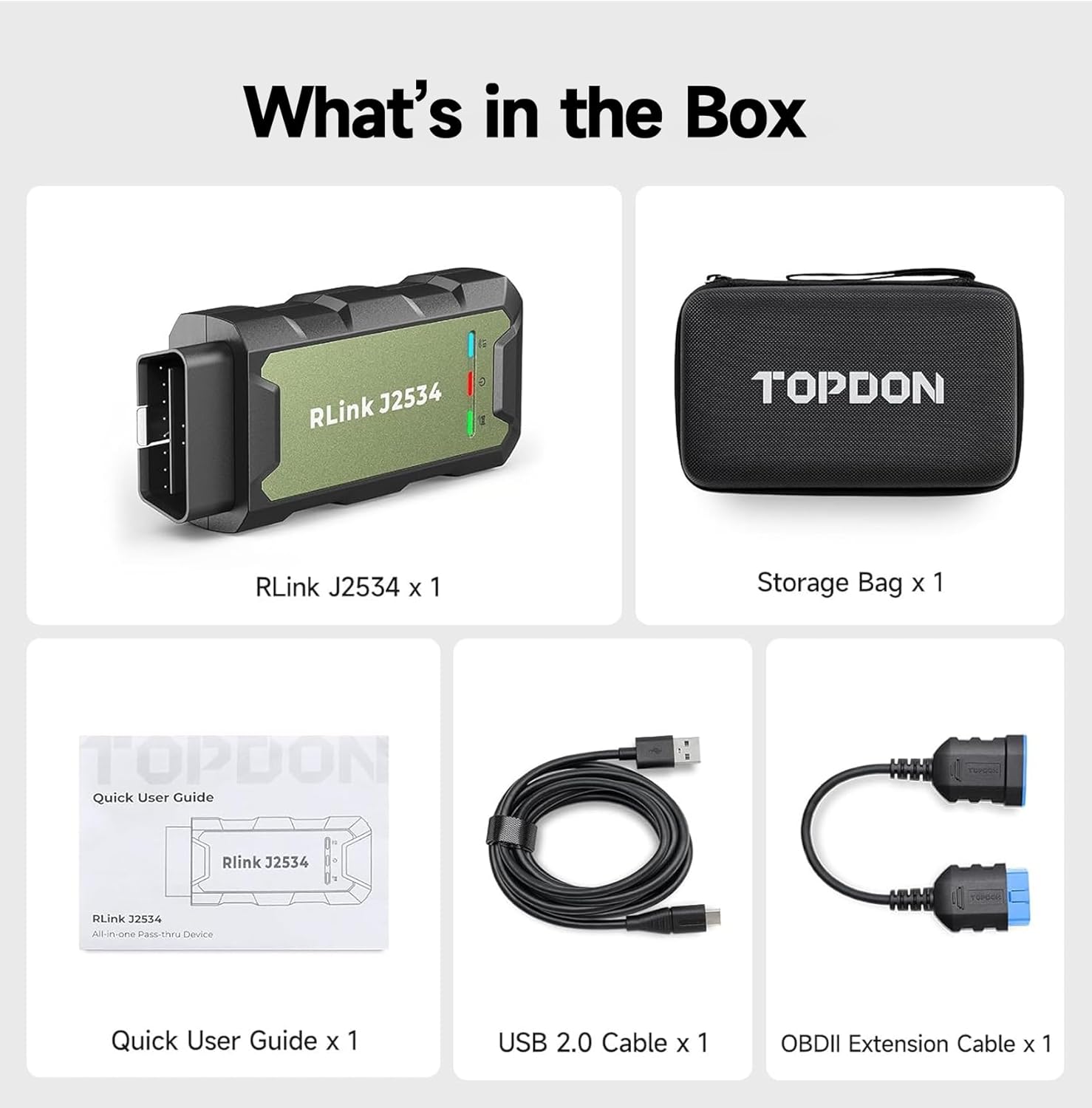 What You Will Get: 1 x RLink J2534; 1 x 1.2 ft OBDII Extension Cable; 1 x 6.6 ft USB 2.0 Cable; 1 x Quick User Guide; 1 x Storage Case; 1 Year Warranty; U.S.-based support service