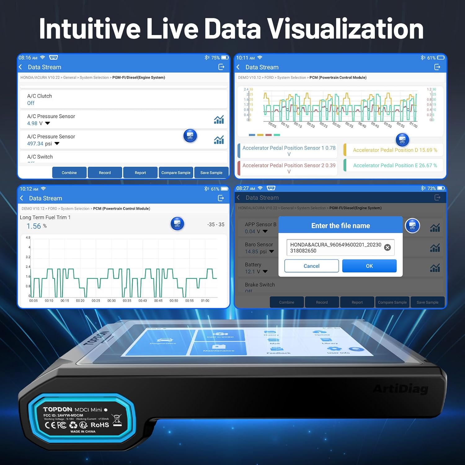 Full System Health Check: Analyze ECM transmission ABS airbag SAS DPF EVAP TPMS BMS EPB and more on-board systems with OE-level diagnostics. Pull and clear codes turn off warning lights check freeze frame data and view live stream in detailed text or merged graph format