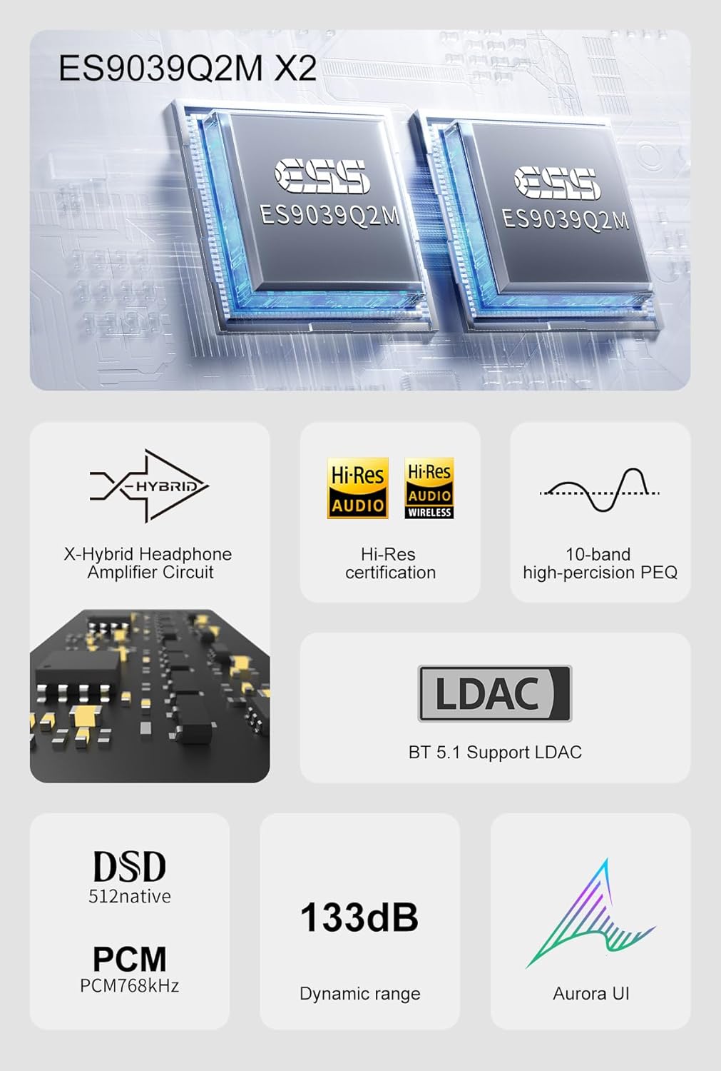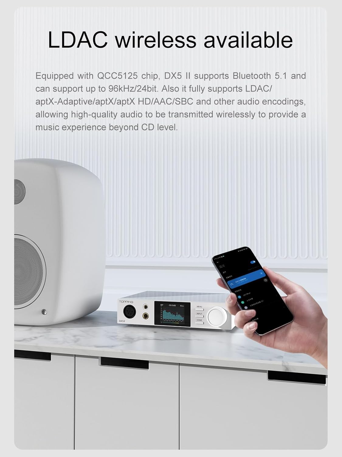 - Equipped with QCC5125 chip The DX5 II supports Bluetooth 5.1 and can support up to 96kHz/24bit. Also it fully supports LDAC/aptX-Adaptive/aptX/aptX HD/AAC/SBC and other audio encodings.allowing high-quality audio to be transmitted wirelessly to provide a music experience beyond CD level
