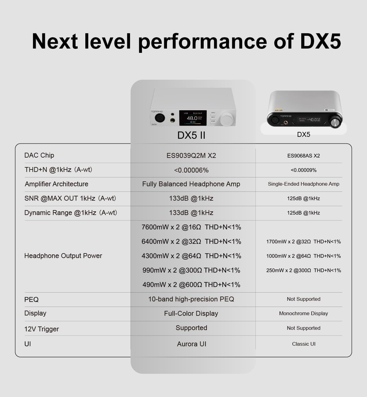 Powerful Balanced Headphone Amp The DX5 II features an X-Hybrid headphone amplifier circuit with fully balanced quad-channel design offering an impressive 7600mW x2 output. Perfect for driving demanding high impedance headphones or sensitive IEMs with no audible noise floor. A must-have desktop DAC amp for HiFi enthusiasts.