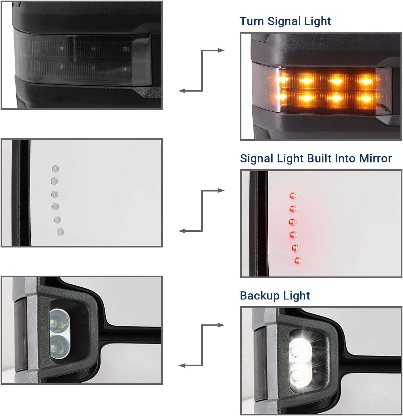 Functions: Adjustable Power glass + Heated Defrost + LED Turn Signal Lights On-Mirror & On-Back + Backup Lamp + Dual Glass (Flat Glass + Convex Glass) + Manual Telescoping & Folding