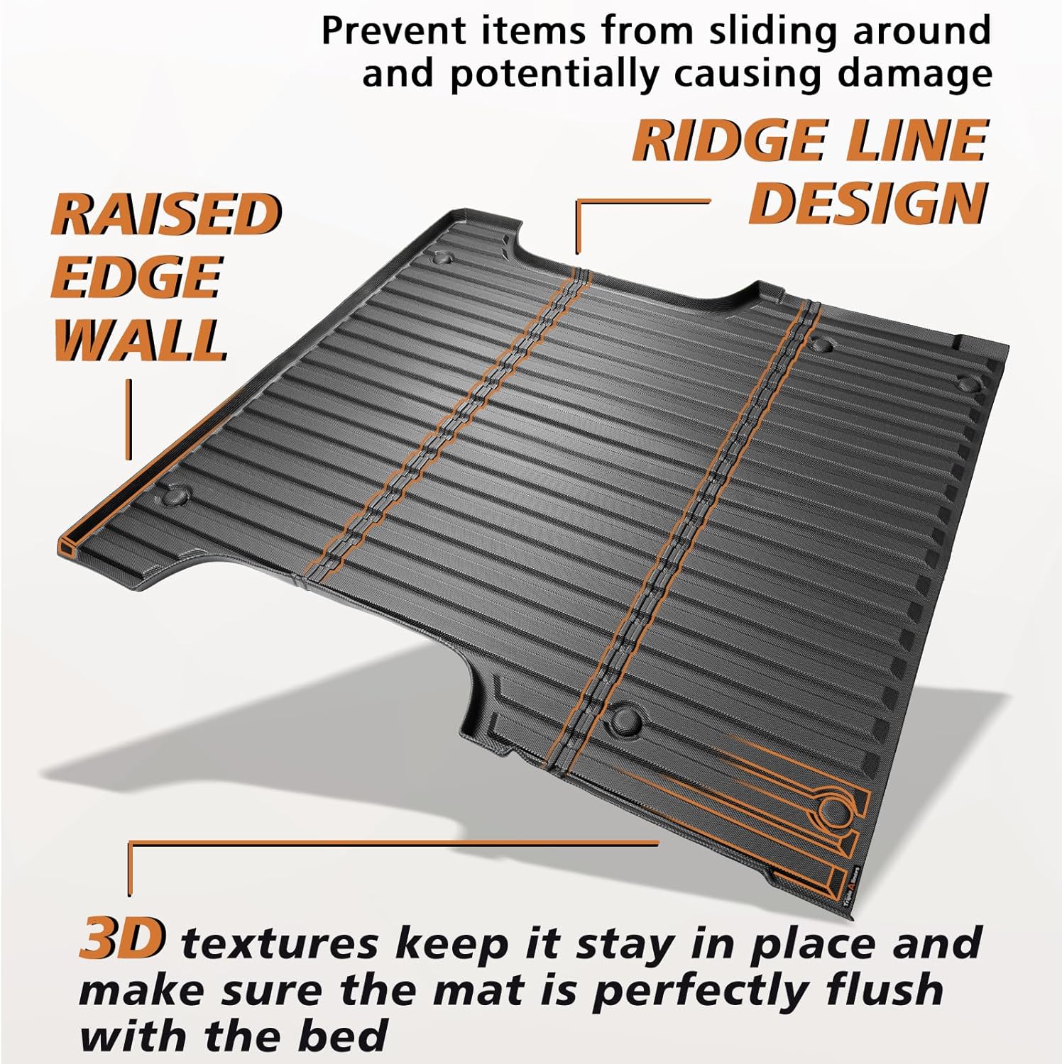 FortiGrip Material: Our truck bed mat is crafted with Patent Pending FortiGrip Material which has a 25% increase in wear resistance and it is tested and proved that it could better prevent items from sliding on the bed mat compared with regular material in the same production way.