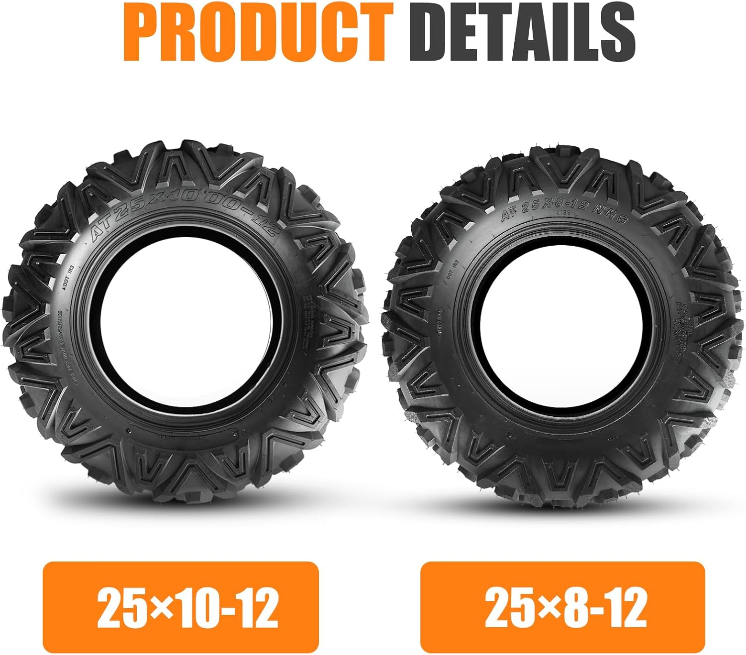 Complete 4-Tire Set: You will get 2 * 25x8x12 front tires and 2 * 25x10x12 rear tires delivered in 2 separate packages that may arrive at different times; please allow 1-2 days between deliveries if your order arrives partially