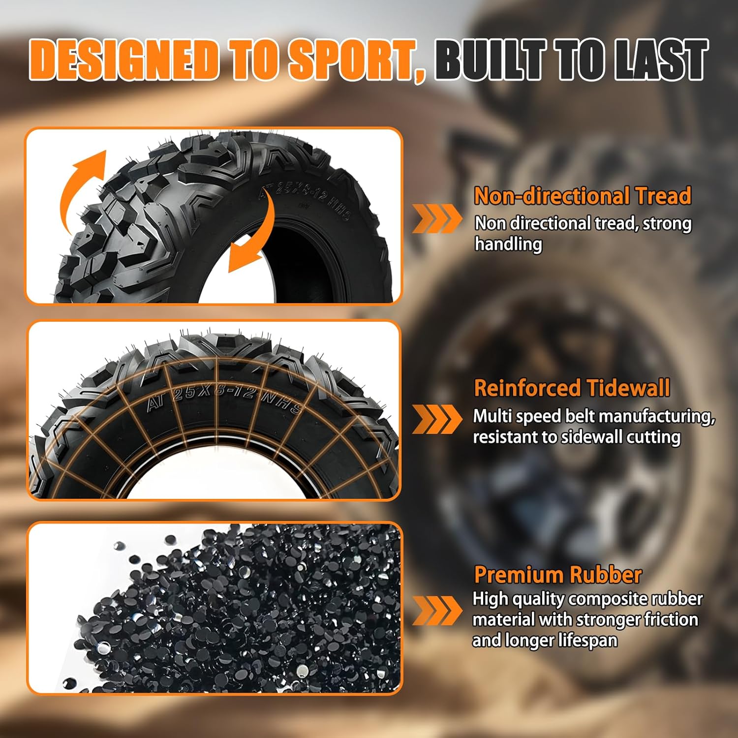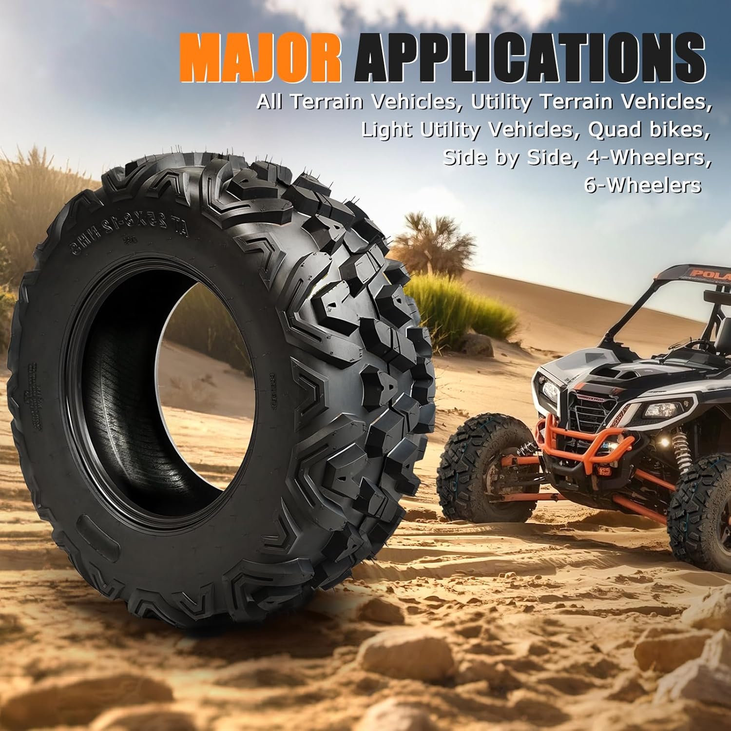 All-terrain Tires: Designed to combine value and performance for everyday use utilizes a matching yet functional front/rear tread design for provide reliable performance on various terrains it is an ideal choice for desert soil rock mud and snow applications