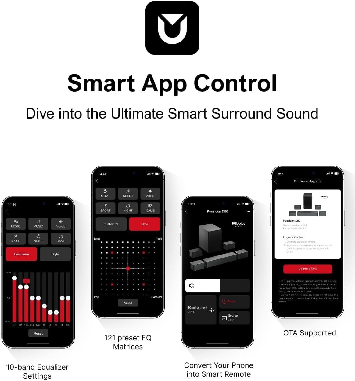 Smart Control at Your Fingertips: With the Smart App elevate your listening experience by customizing your sound system to match your style. The app not only meets all your audio needs but also keeps your soundbar up to date with regular OTA upgrades. This means your Poseidon D80 is always equipped with the latest features for a superior audio experience.