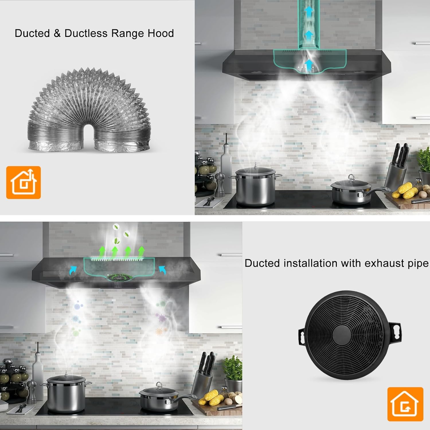 Duct/Ductless Convertible Range Hood : The exhaust fan designed for outdoor vented (duct) or indoor vented (ductless) installations. Stove hood vent is suitable for top or rear venting and you can install under a cabinet or against a wall. Two carbon filters (Included) available for ductless use.