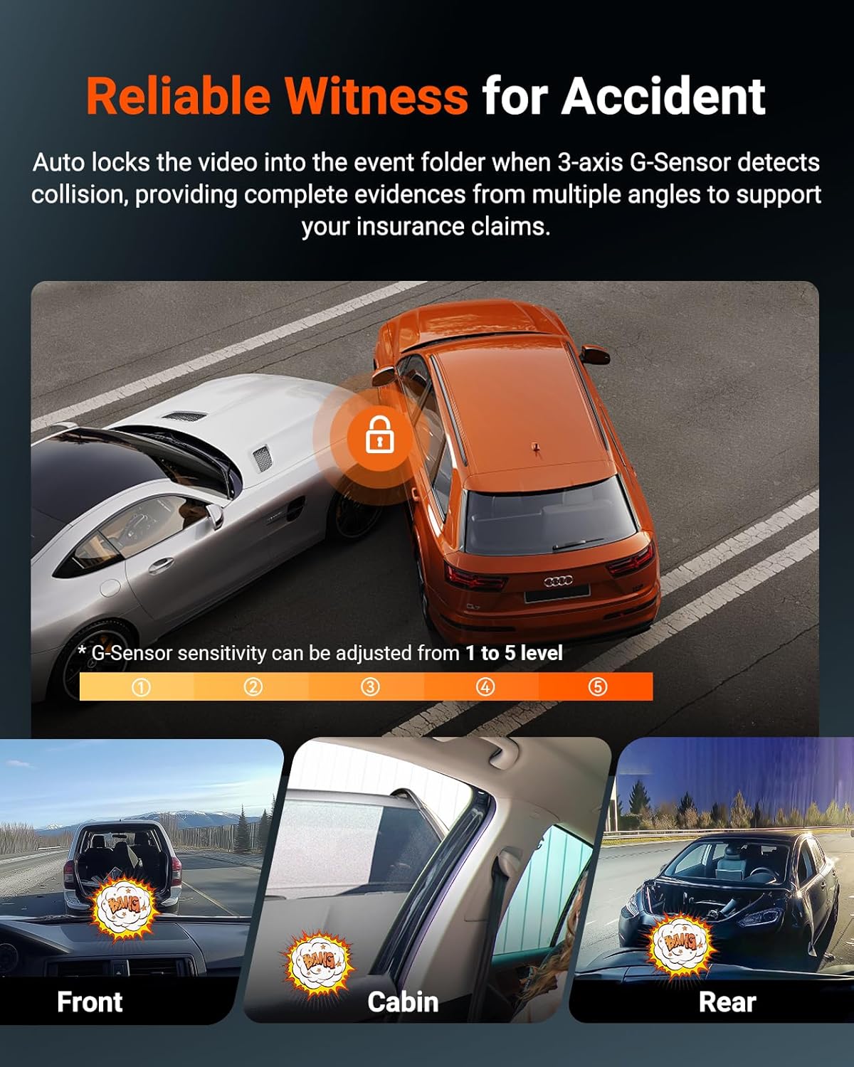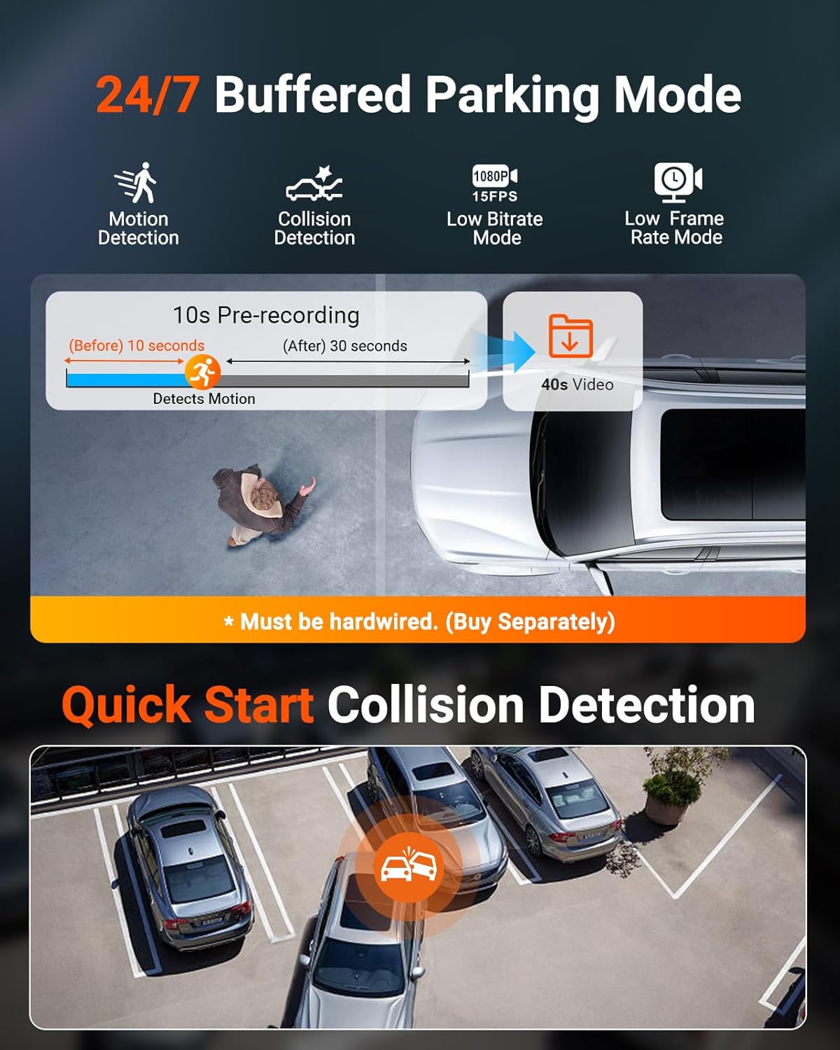 [ 24/7 Parking Mode ] The 10s pre-recording buffered motion detection captures complete events from all directions. Rapid collision detection instantly activates all three dashcams upon impact ensuring critical moments are never missed with this dash cam with 24 hour parking mode. Dual power-saving tech (low bitrate/frame rate) protects your batterydelivering 24/7 worry-free protection against vandalism or hit-and-runs without draining power. Requires hardwiring (Sold separately).