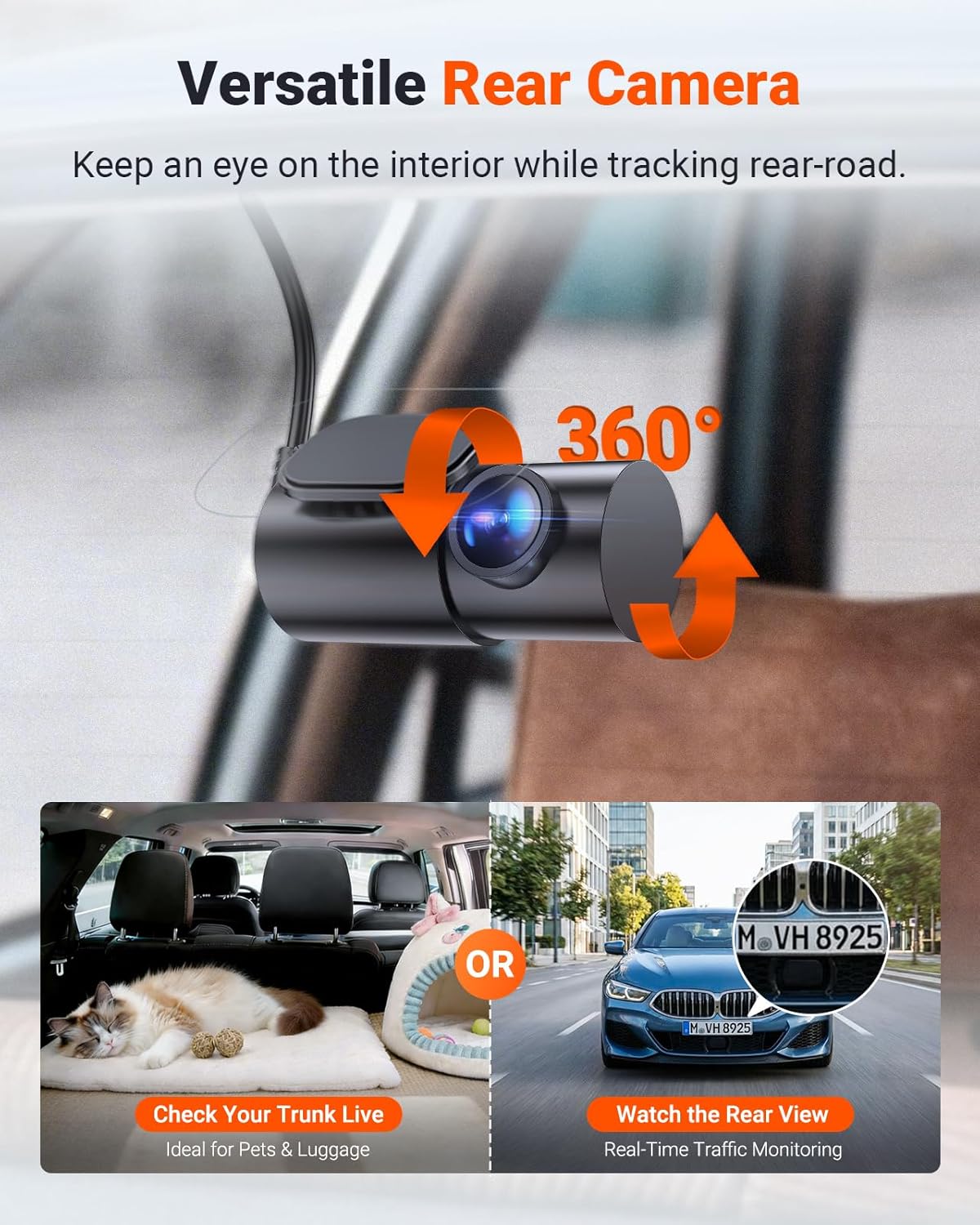 [ Easy to Install & 360versatile Rear Camera ] Set up effortlessly with our magnetic GPS mount static cling film and cable clips. Everything is toolfree for a clean wirehidden installation and the mount stays stable on any drive. The rear camera rotates 360 letting you monitor rear traffic or pivot it inward to keep an eye on cargo luggage or pets inside the vehicle. Versatile coverage whenever you need it.