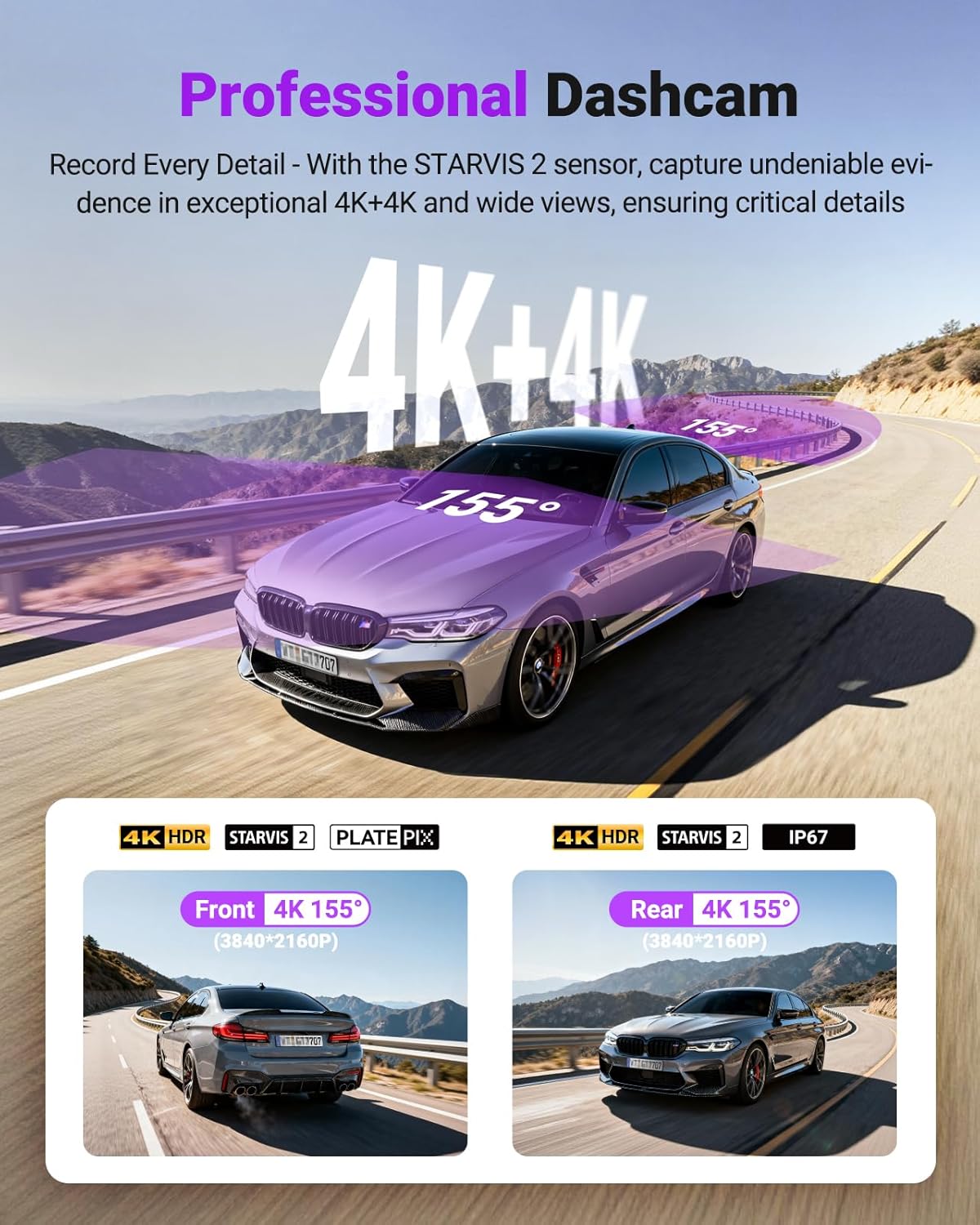 [First Dual STARVIS 2 Night Vision] Dash cam for cars redefines nighttime driving safety with Flagship Dual STARVIS 2 and exclusive PlatePix Tech. Capture sharp footage even on dimly lit streets. STARVIS 2 ensures superior low-light sensitivity while Dual HDR balances extreme lighting to eliminate overexposure. PlatePix Tech. further sharpens license plate clarity delivering critical video. Designed for reliability its the ultimate co-pilot for drivers who prioritize safety after dark.