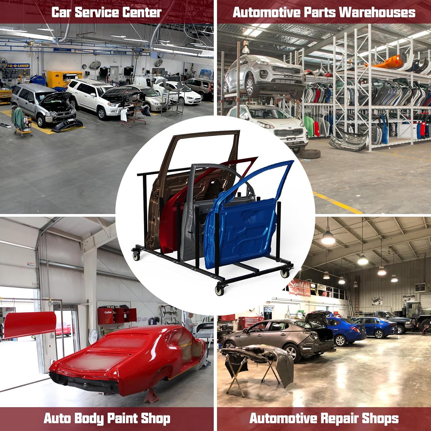 Versatile Application: Vehicle door storage cart could be used in various areas of the workshop or facility including auto repair shops warehouse storage body shops... offering efficient storage solution for doors. Vehicle door storage cart promote flexibility in storage and improving workflow efficiency.