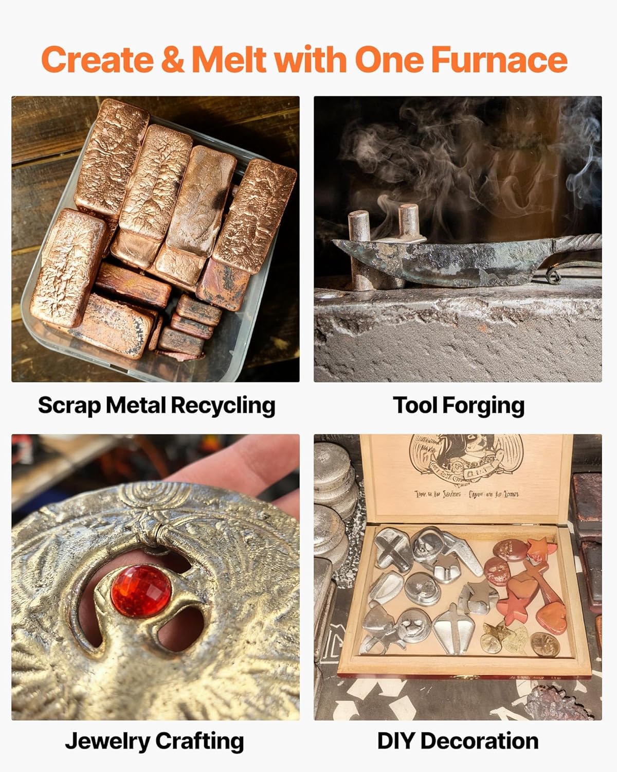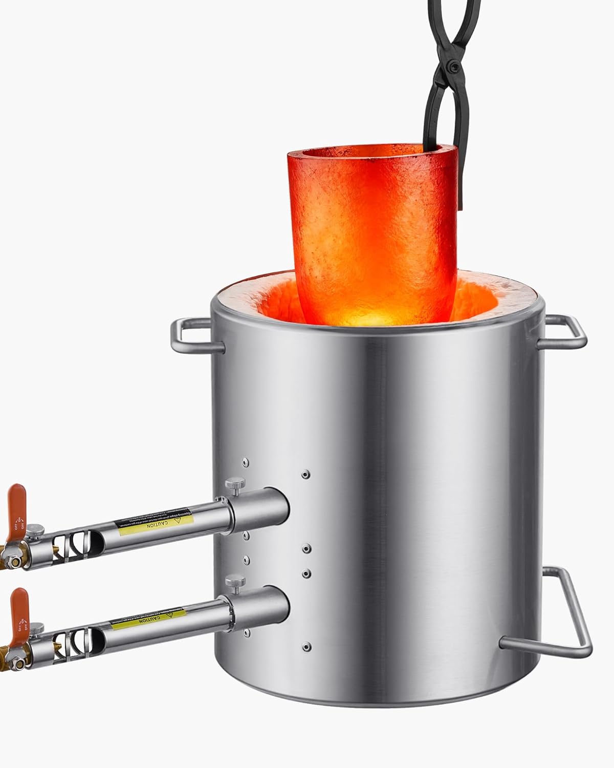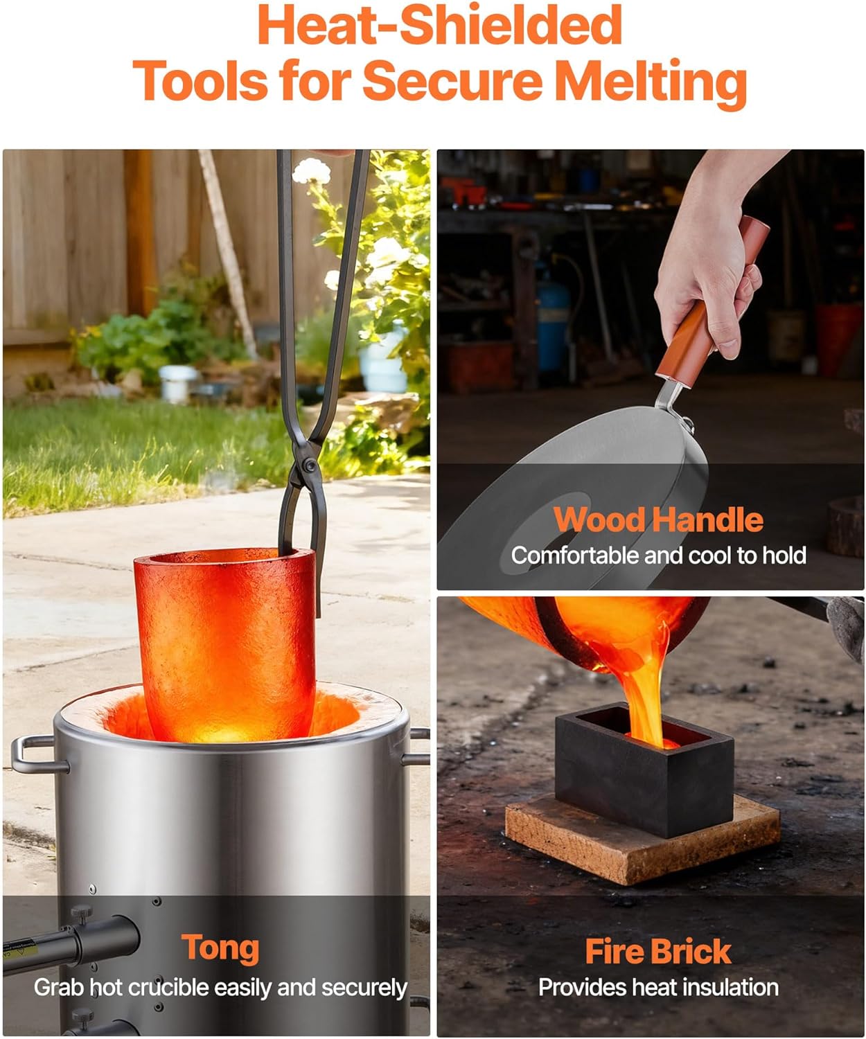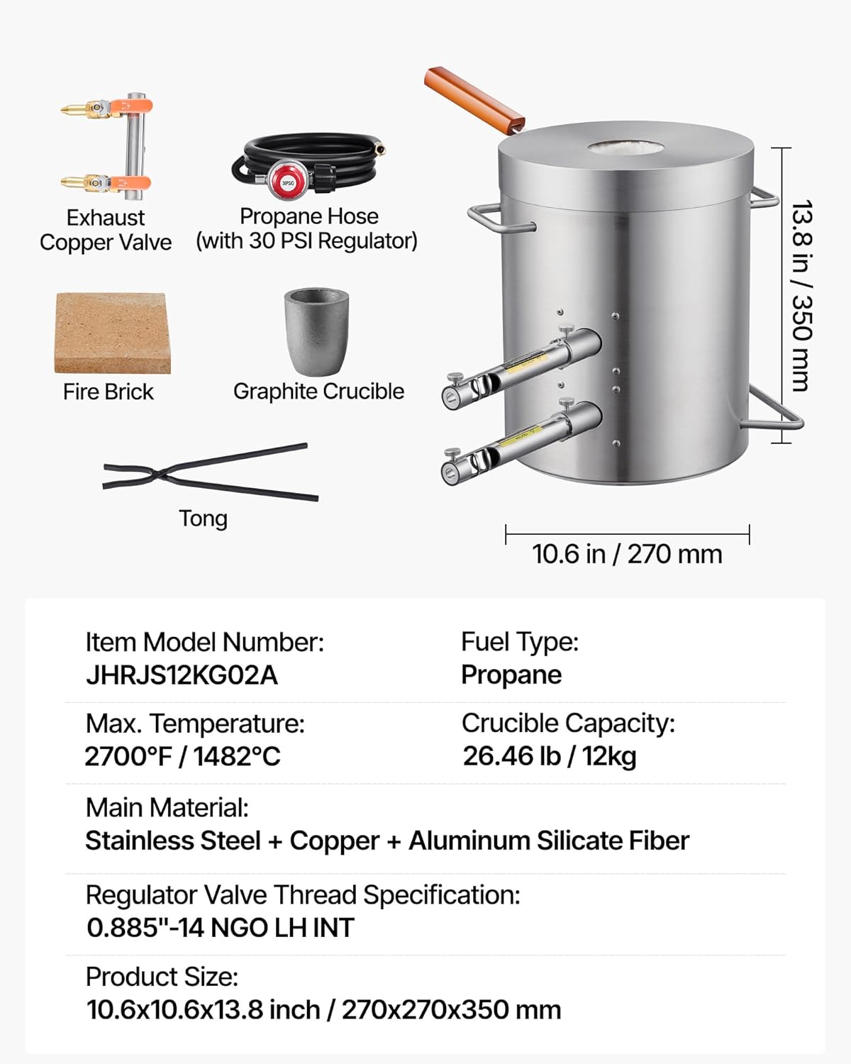 Everything In One Box: Get started right away! We include all you'll need to get melting the day you receive your order. Our smelter comes with a furnace 2 burners a 12kg crucible a high strength tong a propane pipe w/pressure gauge pre-assembled components(connecting pipe 2 valves 2 nozzles) 1.5 fire bricks a handle and an instruction manual. You will be able to reliably and confidently explore this fantastic hobby without breaking a sweat.
