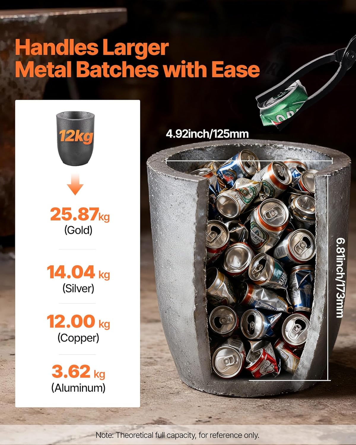 Stainless Steel Structure: Our propane furnace is crafted from robust stainless steel making it more durable and long-lasting. The upgraded cover is non-welded and integrated. It is also equipped with a high-density graphite crucible. This 12kg large capacity means you can melt 26kg gold 14kg silver 12kg copper or 3.6kg aluminum. What are you going to make first?