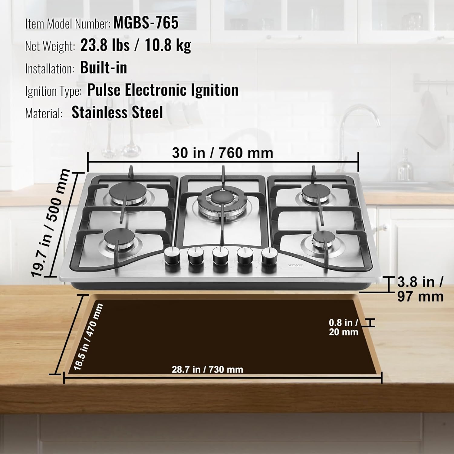 Versatile Compatibility: Our propane cooktop offers adaptability with LPG/NG convertible nozzles enabling easy connection to either gas or natural gas supply. Its standard 28.7x18.5xR0.8-inch opening size ensures a perfect fit for most kitchen installations offering versatile options for various setups.