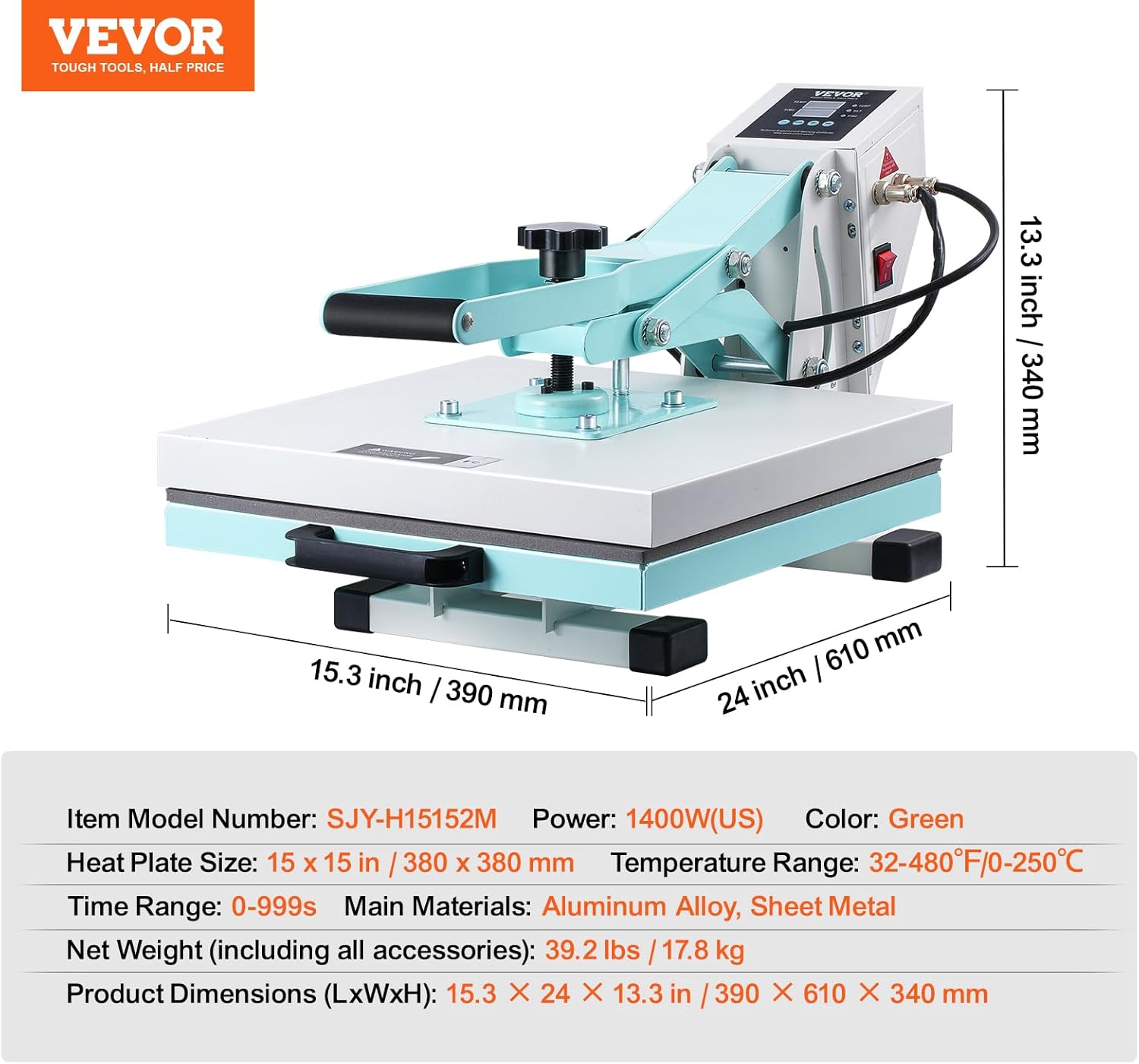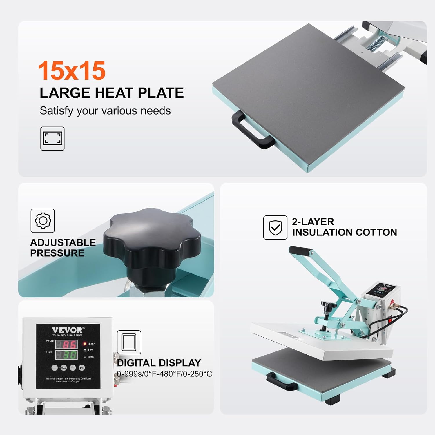 Large Heating Plate: The 15x15 inch heat plate constructed from durable thick steel plate stamping and aluminum die-casting offers excellent strength and longevity. The machine automatically beeps or powers off once the transfer is complete for added convenience.