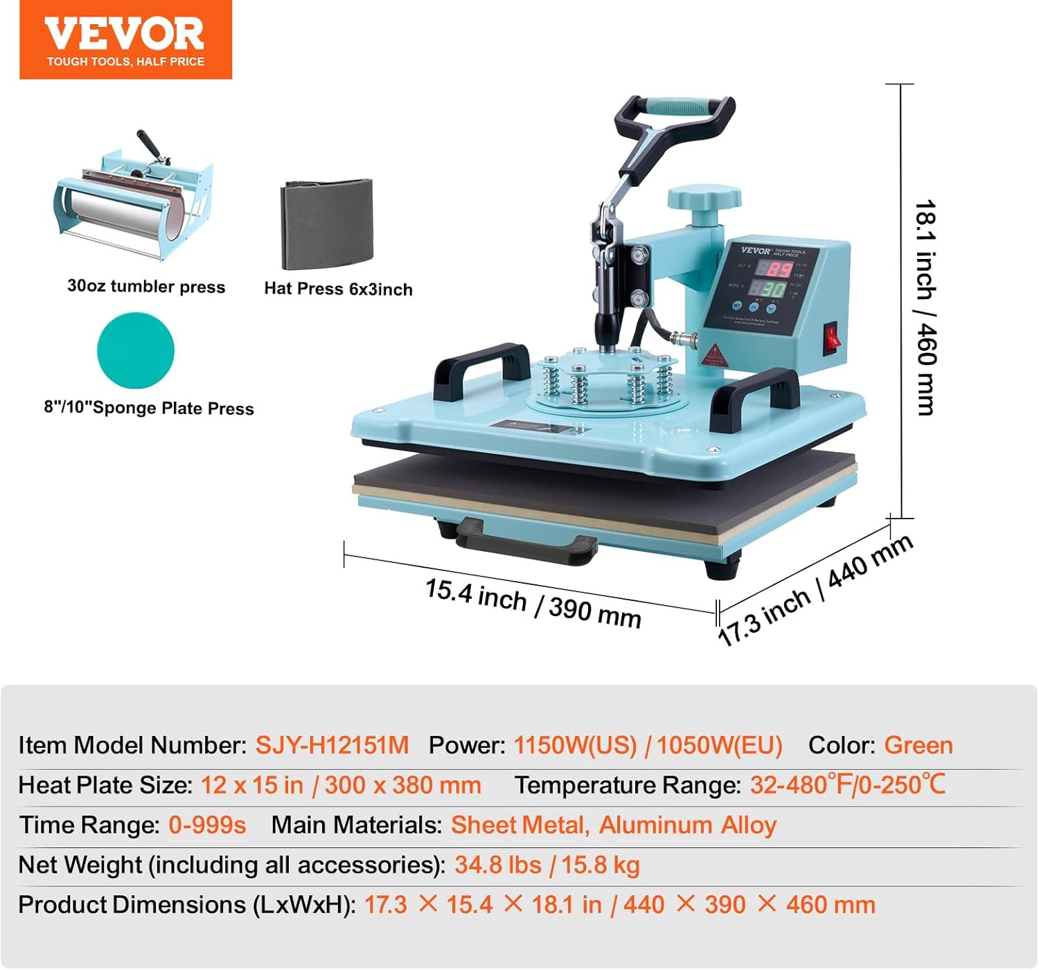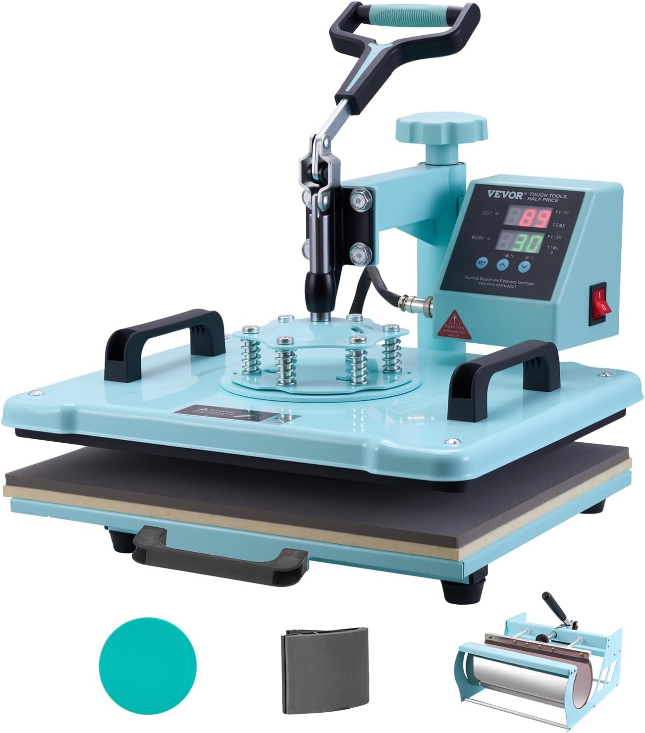 Precise Digital Control: You can preset the temperature and time according to different transfer materials to achieve satisfactory results. Temperature range: 32-480 / 0-250 time range: 0-999s. You can switch between C and F with the (/) buttons to select your desired temperature display mode. When the preset temperature is reached the heat transfer machine will automatically stop and sound an alarm preventing over-heating.