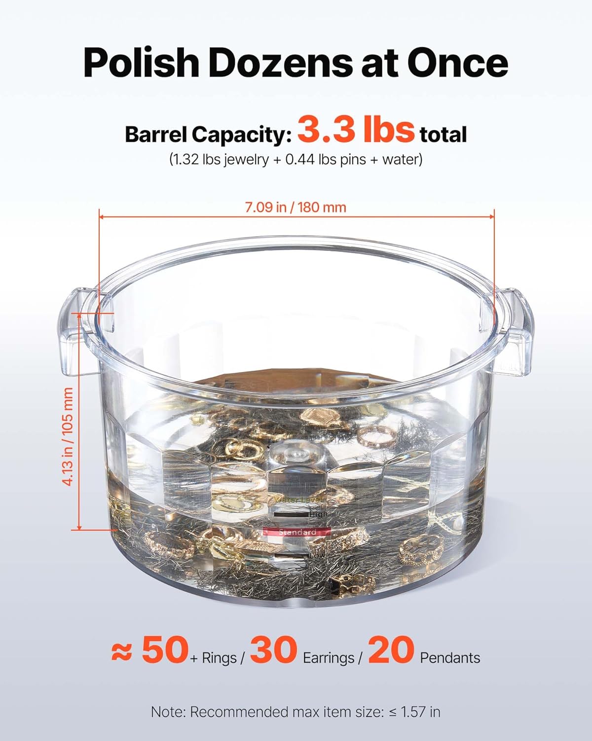 Premium Polishing Barrel: The jewelry tumbler polisher is made of tough polycarbonate with high hardness and no leakage. Roller Size: 7.3 x 5.1 in / 185 x 130 mm Capacity: 1.76 lbs / 800 g.