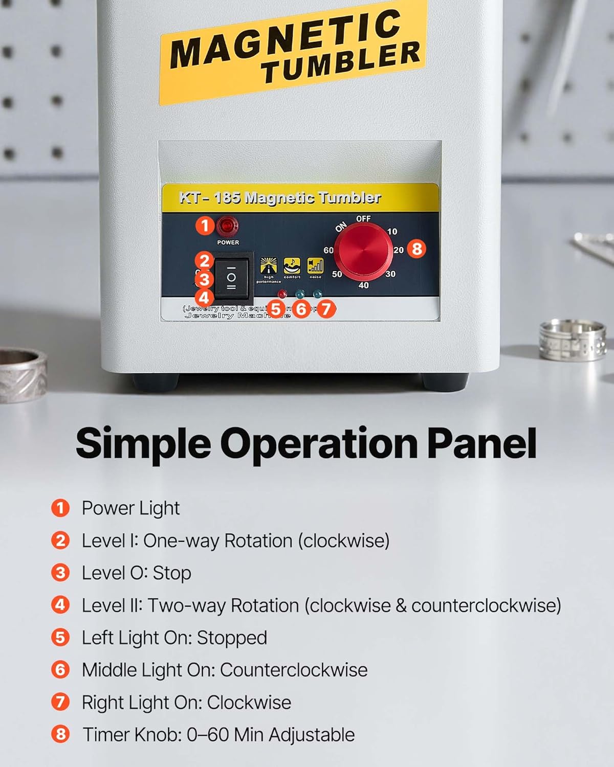 Concise Control Layout: The full-featured clear buttons on the panel allow you to easily set the magnetic tumbler jewelry polisher's time and rotation mode. It can reach a multi-angle full grind of the workpiece quickly removing rust.