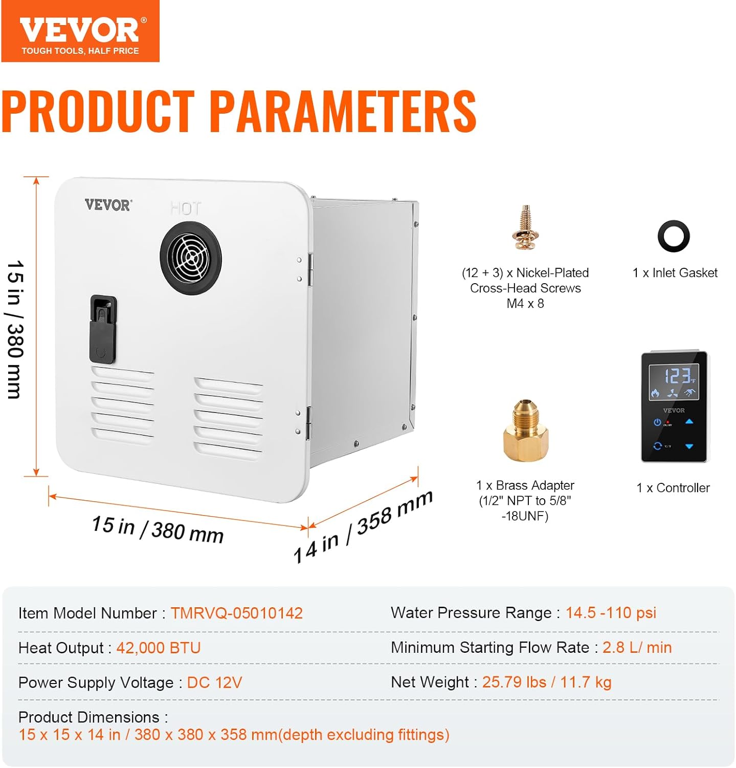 Compatible with Most RVs: With a door size of 15x15 inches a rear chamber size of 12.6x12.6x14 inches and 1/2" NPT water and gas connectors plus a 2.36" exhaust pipe this camper water heater is designed to suit various RVs. Quick connections make setup a breeze!