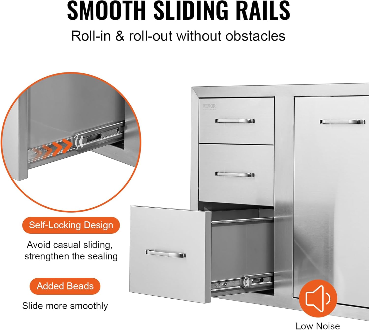 Smooth Sliding Rails: With silent sliding rails our outdoor drawer can provide a pleasant family atmosphere with no irritating noise. Compared with others ours adds beads which is smoother to roll-in and roll-out. Additionally the stable open-close design keeps dishes fixed in place.