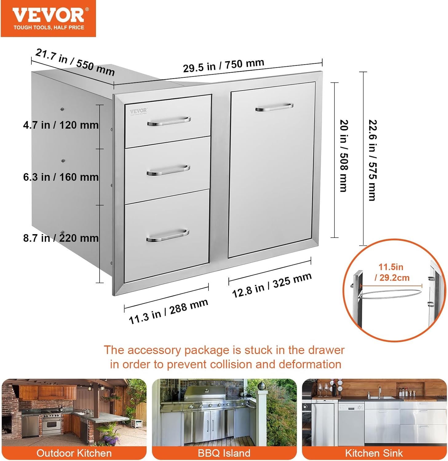 Premium Details: The stainless steel BBQ drawers were built with a lot of consideration providing you maximum convenience and security. Integrated high-end design no drilling required for installation good for sealing. Round corners can reduce the scratch while using; a sleek handle can allow you to open the drawer effortlessly; the seamless design can keep your inside items dry and secure.