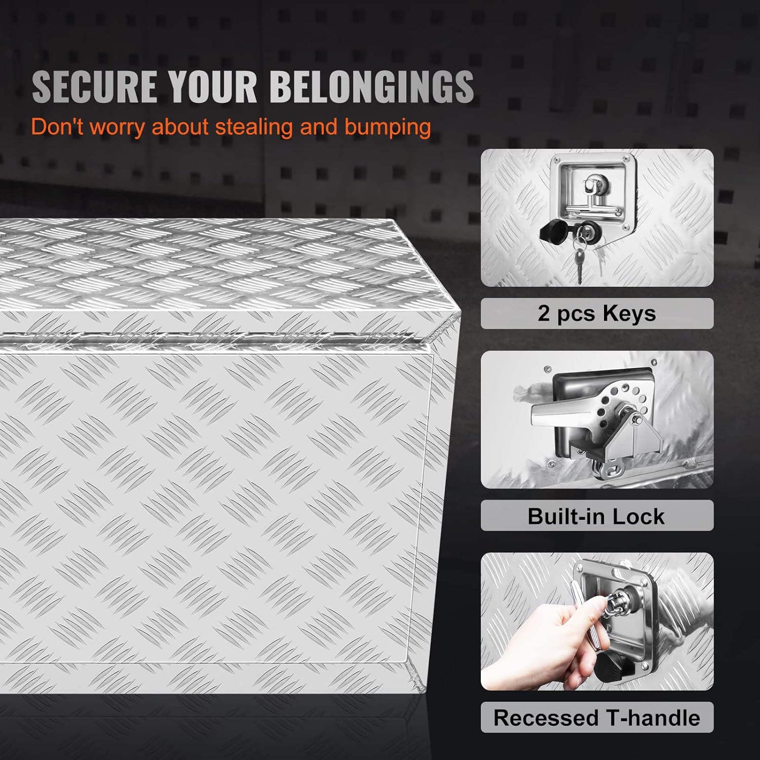 Safety Comes First: The embedded T-shaped handle of this underbody box is designed without bulge making it resistant to scratches and hits during driving. The box is lockable and comes with two exclusive keys to ensure the security of your items. Increase your underbody storage space with this truck box and have peace of mind knowing your belongings are safe from theft.