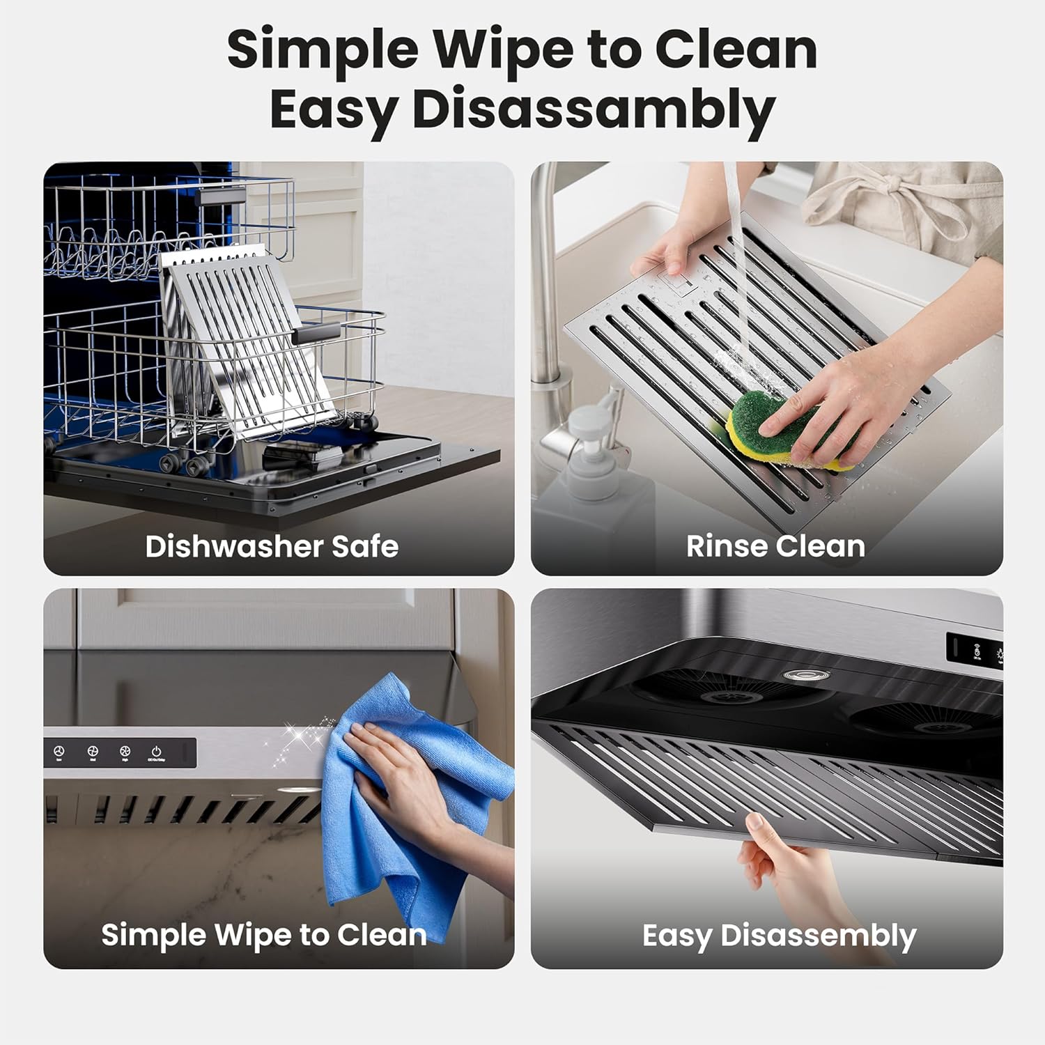 [Stainless Steel + Durable + Fingerprint-Resistant] This under cabinet stove hood is built with commercial-grade stainless steel and widened filters for long-lasting durability and efficient grease capture. Ideal for busy households it is smudge-proof and fingerprint-resistant for easy cleaning extending its service life to 10+ years.