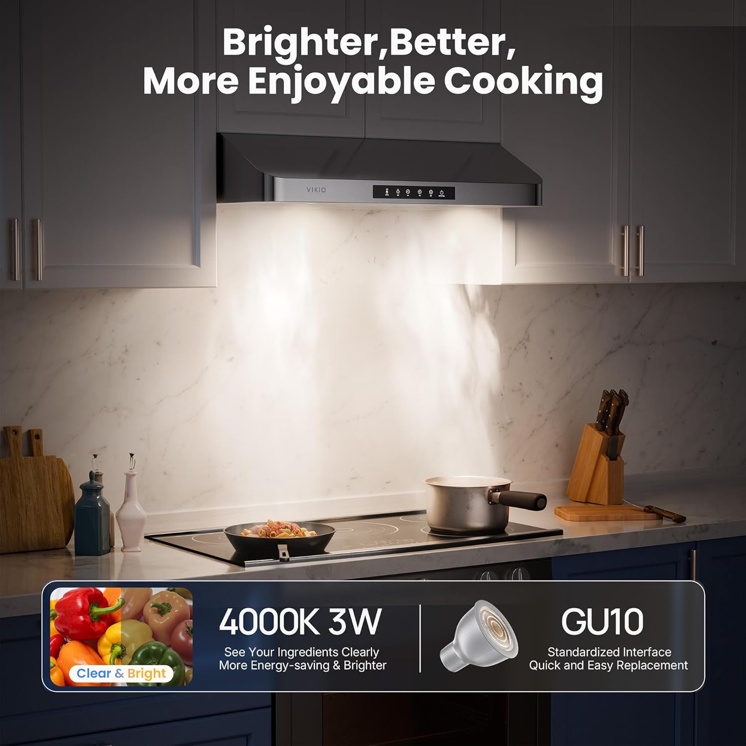 [Bright Lighting + Easy Replacement + Energy Efficient] This under cabinet range hood uses standard GU10 bulbs that are easy to replace. Energy-efficient LED options can reduce energy consumption by up to 30%. With DIY replacement in just one minute it saves power time and cost.