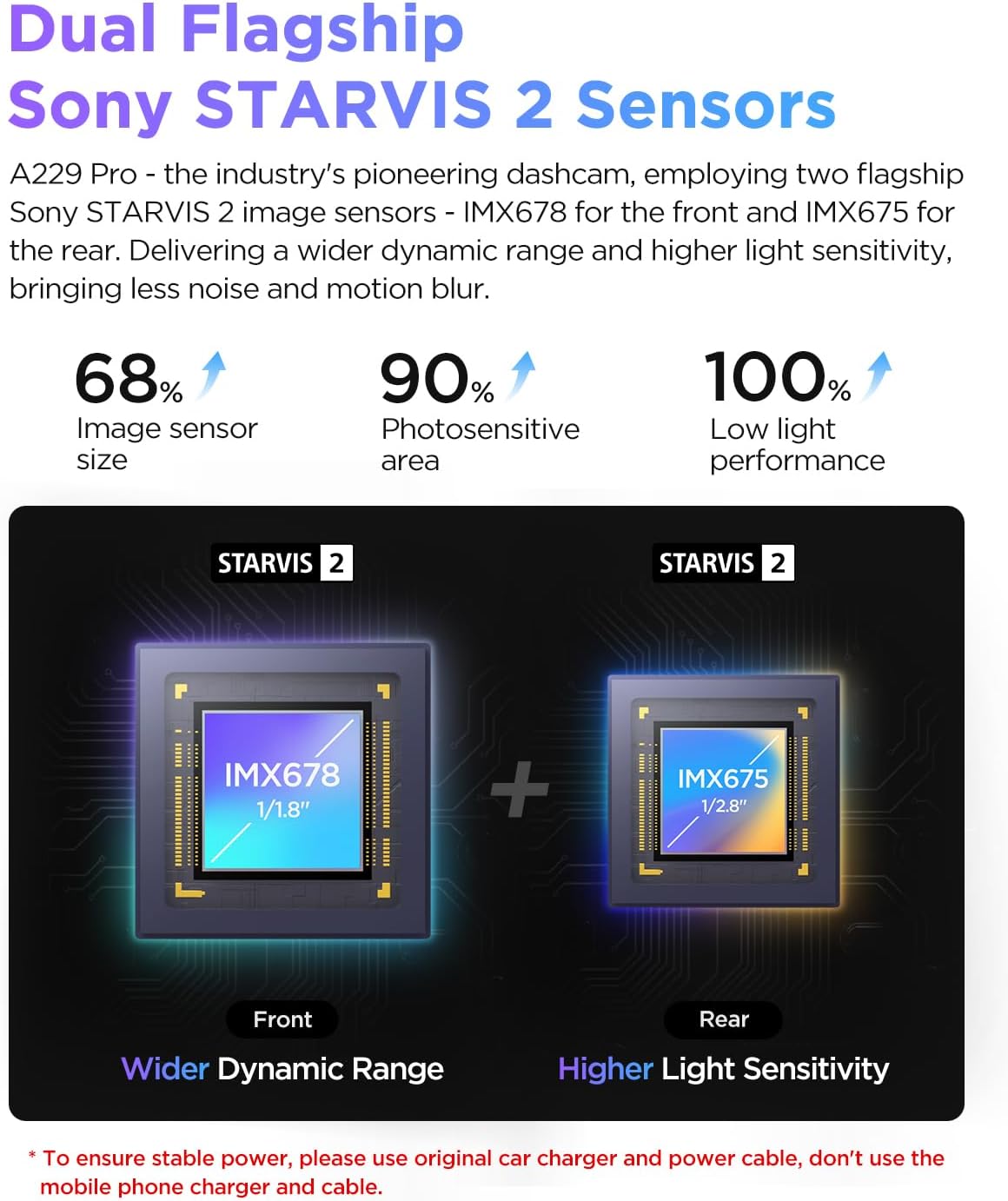3 Channel 4K Dash Cam with STARVIS 2 Sensors The 3-channel dash cam A229 Pro 3CH is equipped with two flagship STARVIS 2 image sensors IMX678 and IMX675. It supports 4K resolution for the front camera 2K for the rear camera and 1080P for the cabin camera. It delivers smooth cinematic 4K image quality and ensures effortless license plate reading and detail capturing day and night. Providing you all-around security monitor. It's a great choice for family trips/Uber/Lyft drivers.