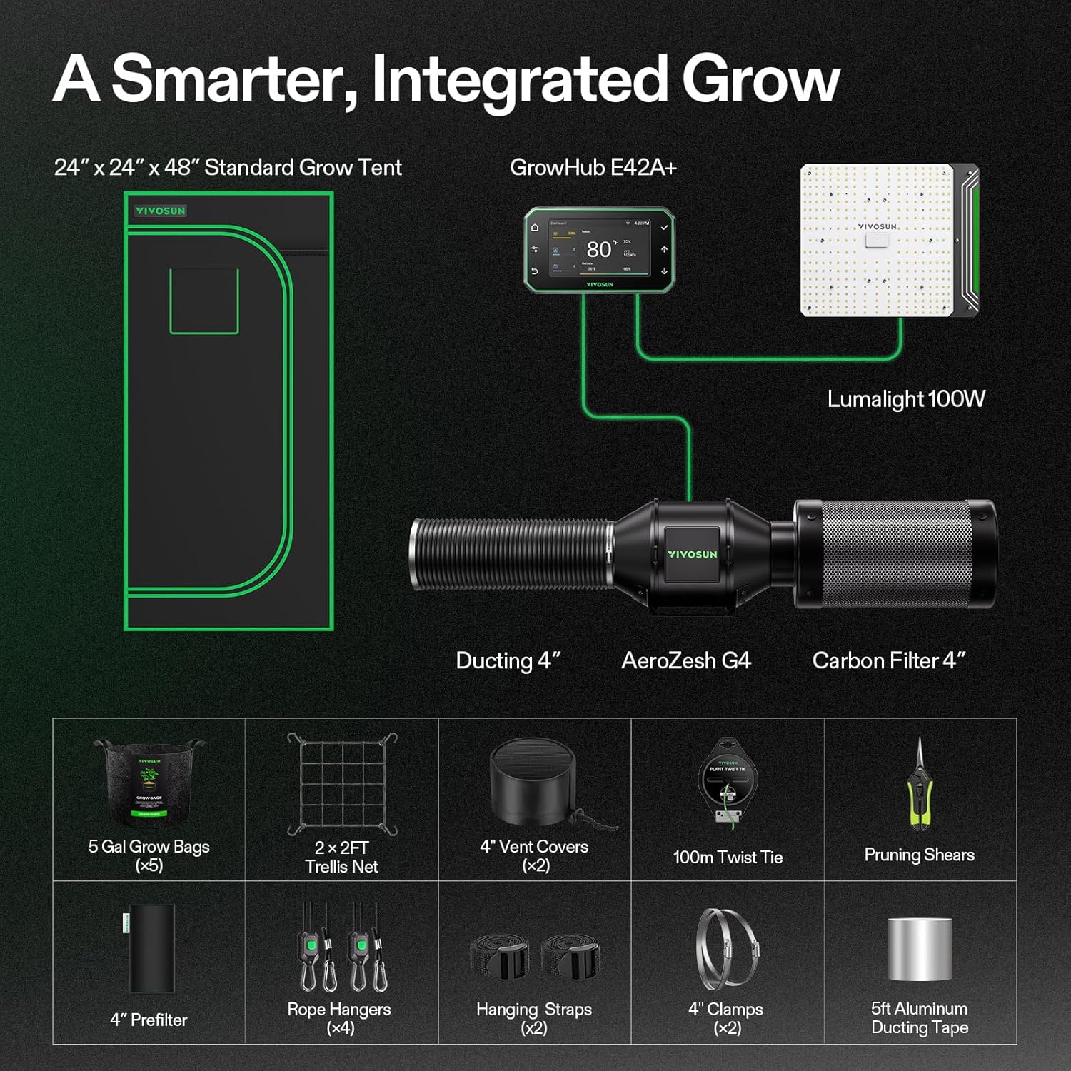 Complete Growing Kit: 24" 24" 48" Standard Grow Tent; LumaLight 100W Grow Light; 4" AeroZesh G4 Duct Fan; GrowHub E42A+ Controller; 4" Carbon Filter; 4" Ducting; 4" Clamp 2; 4" Prefilter; 2 2ft Trellis Net; 5 Gal Grow Bag 5; 4" Vent Cover 2; Pruning Shears; 100m Twist Tie; 5ft Aluminum Ducting Tape; Rope Hangers; Hanging Straps