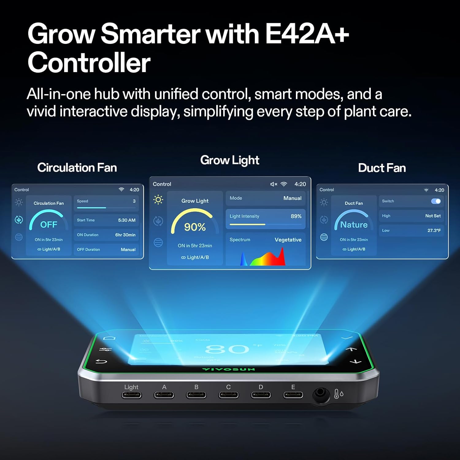 Integrated Control Made Easy: The GrowHub E42A+ connects all devices into one smart system letting you manage the grow light inline duct fan and more in one app; Real-time temperature and humidity sensors track indoor and outdoor conditions while the app makes it easy to monitor data and adjust settings anytime anywhere