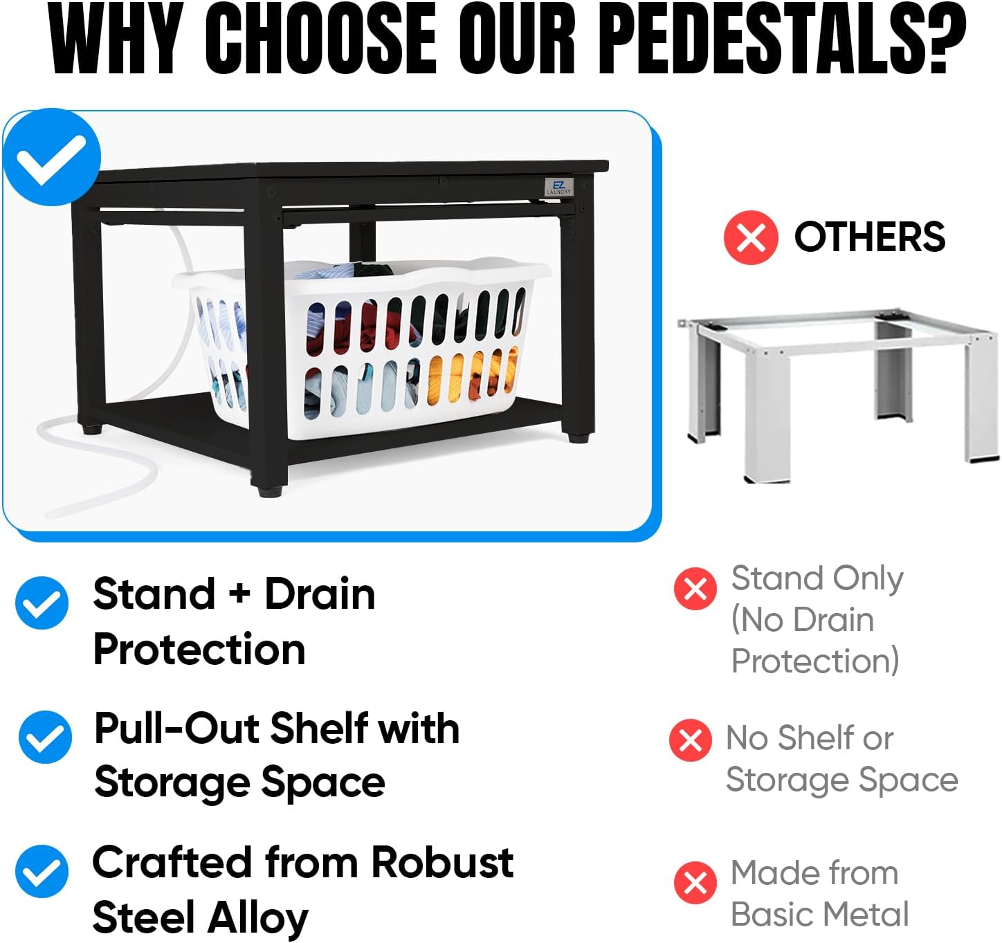 It improves comfort by raising machines to a better height reduces back pain protects your floors from leaks and adds practical features like a pull-out shelfall while being built to last with a heavy-duty steel frame.