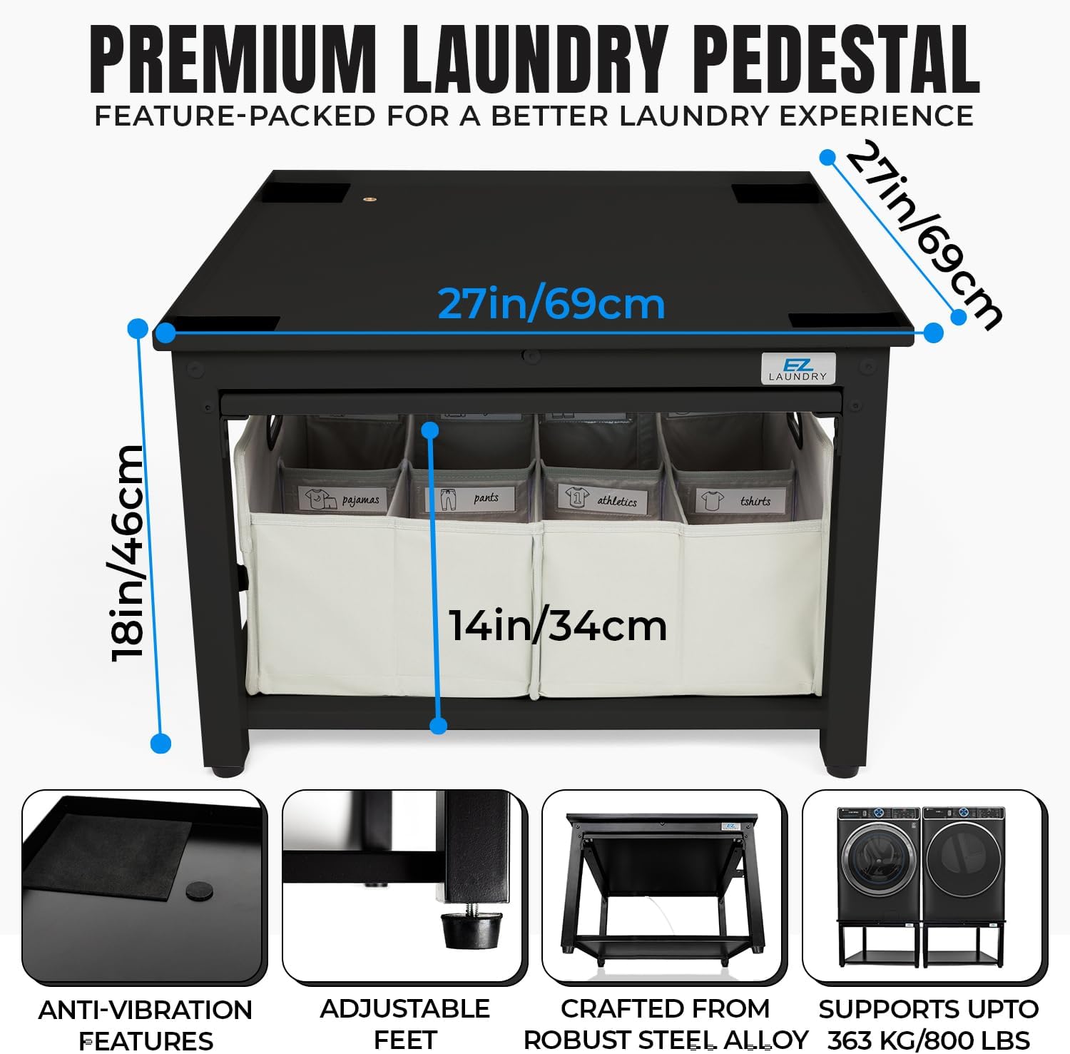 Impressive Weight Capacity: Trust the durability of our washing machine stand crafted from robust alloy steel to securely hold up to 800 lbs. Compatible with major brands offering the ultimate stability for your laundry appliances.