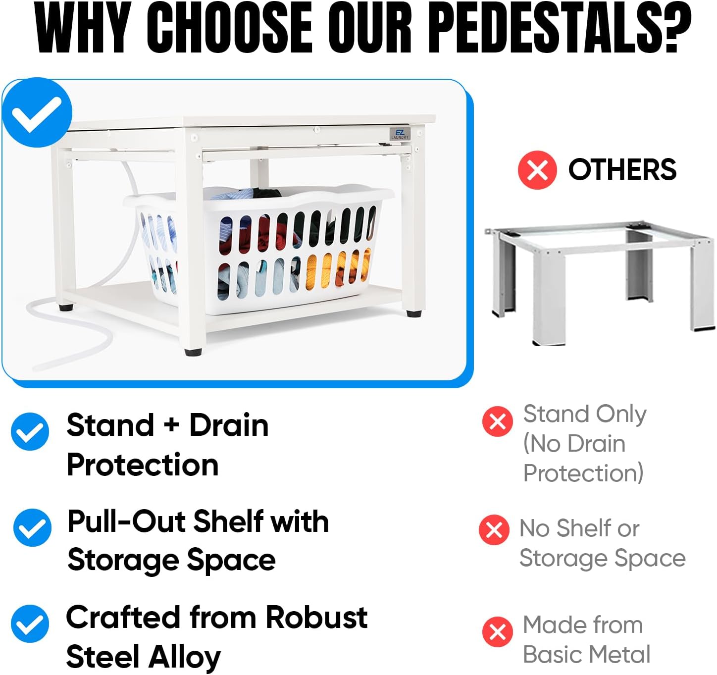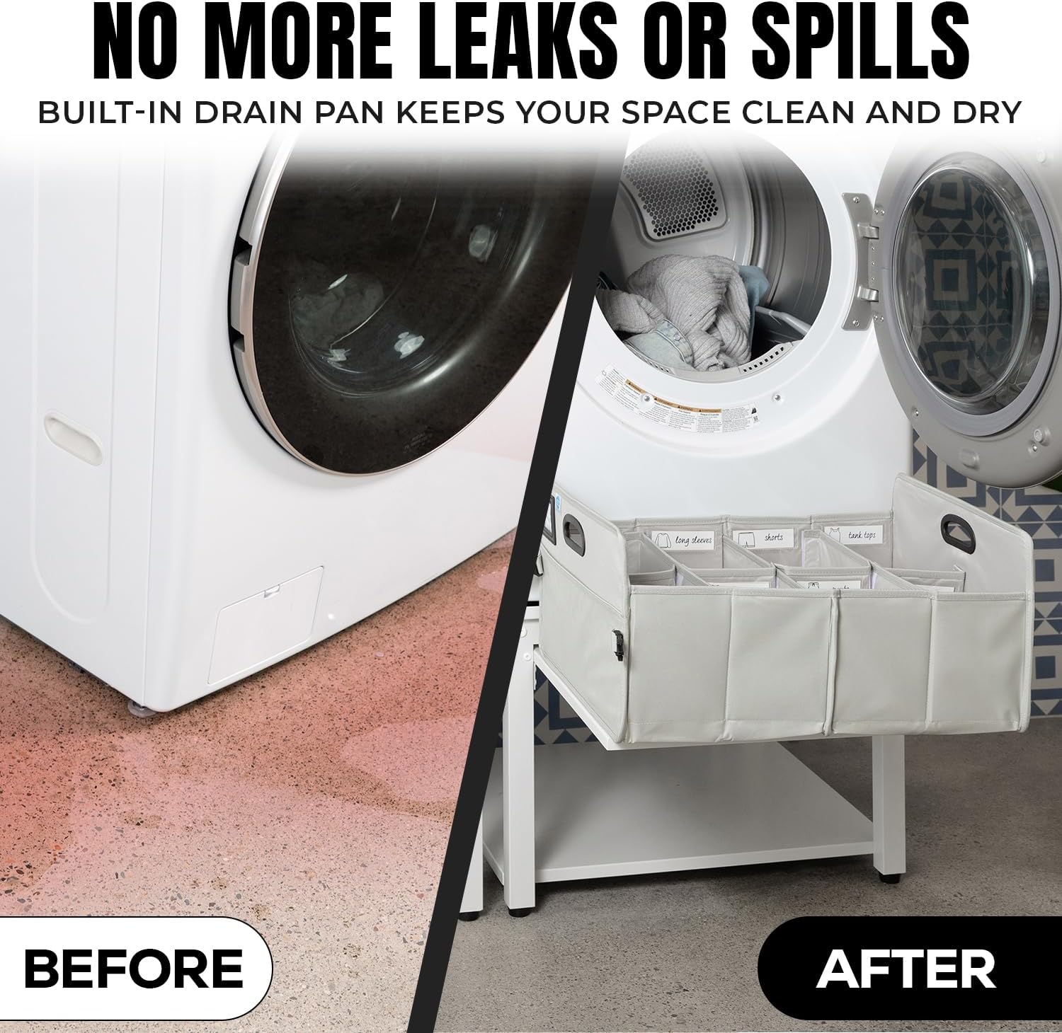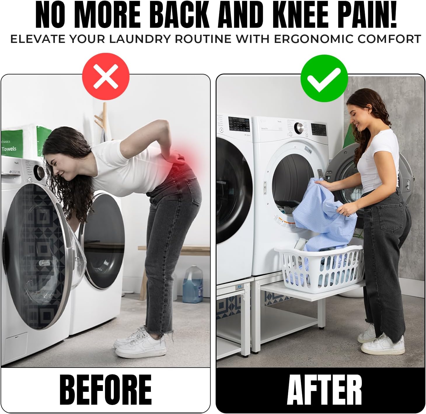 It improves comfort by raising machines to a better height reduces back pain protects your floors from leaks and adds practical features like a pull-out shelfall while being built to last with a heavy-duty steel frame.