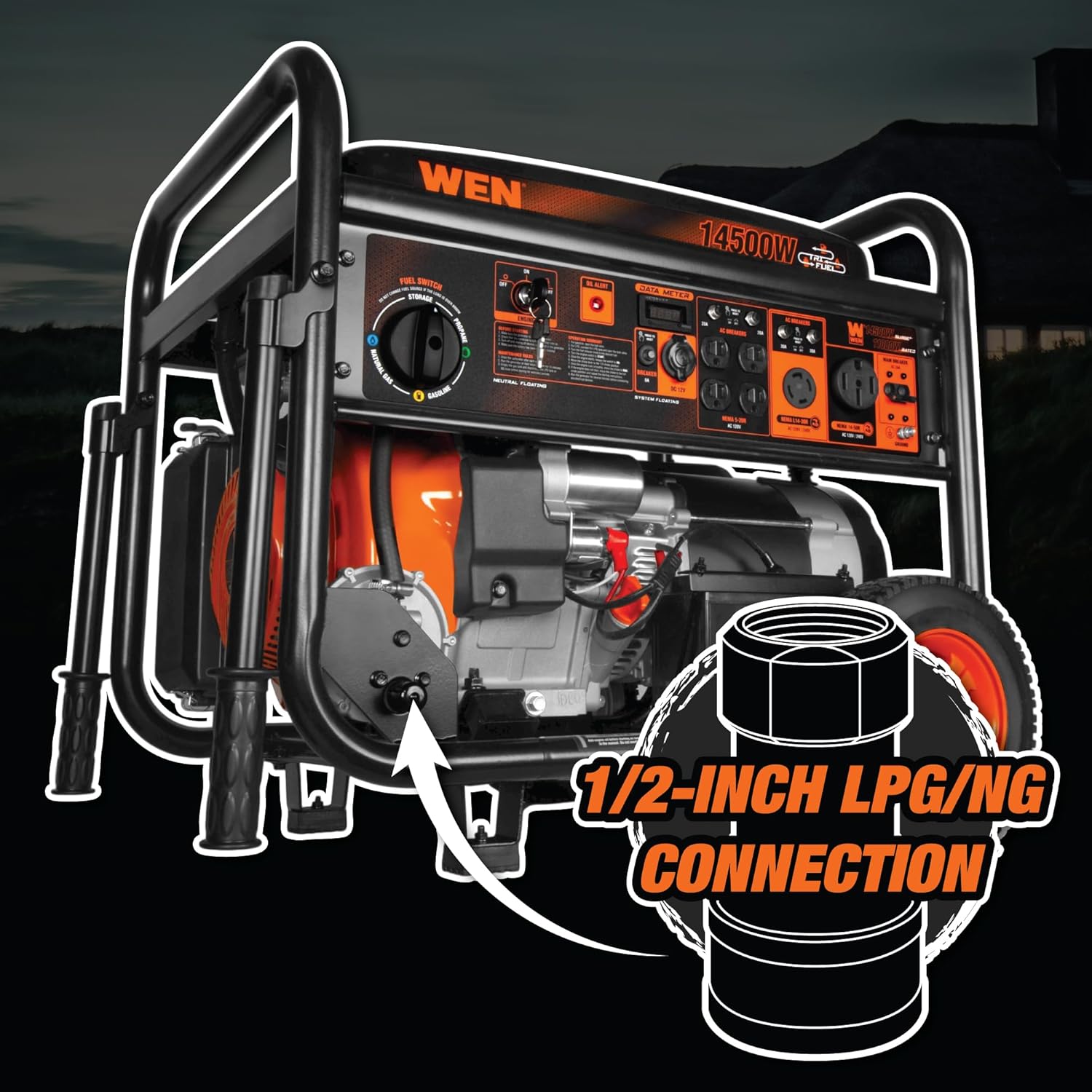 Includes four 120V 5-20R outlet a 120V/240V transfer-switch-ready NEMA L14-30R outlet a 120V/240V transfer-switch-ready NEMA 14-50R outlet a 12V DC automotive outlet a bottle of oil a 6-foot LPG connection hose an NG quick-connect adapter and a three-year limited warranty