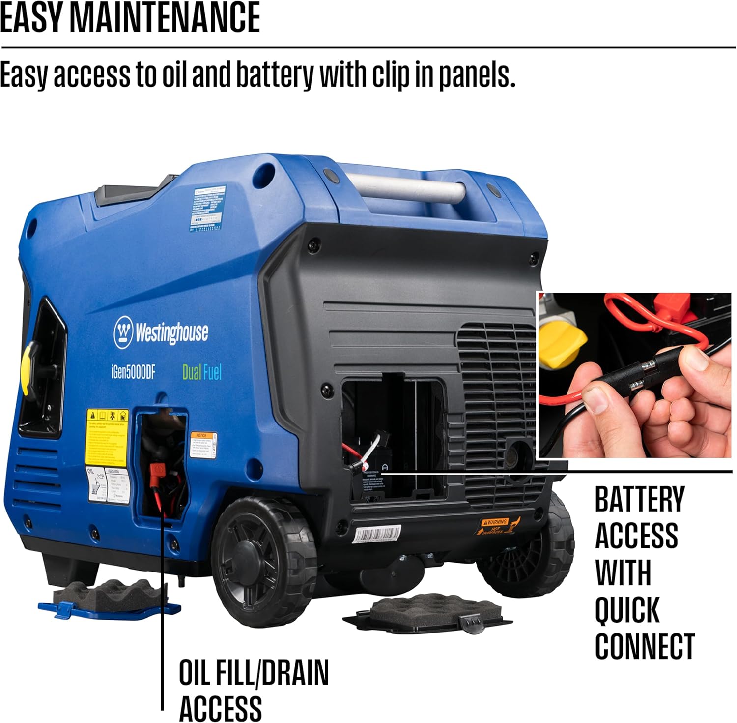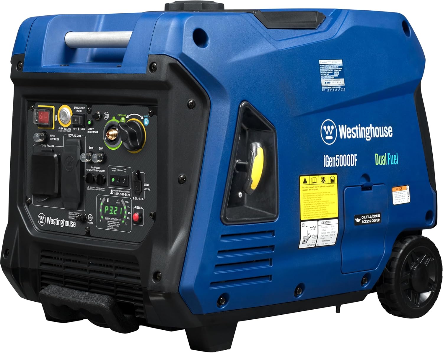 The iGen5000DF Dual Fuel Inverter Generator is a premium power solution to meet your portable power needs whether you're camping or on the go. With a TT-30R RV Ready Outlet two 20A household outlets and built-in USB ports this generator is ideal for recreational activities or as an emergency backup source. It's engineered for maximum fuel efficiency with variable engine speed to produce only the power you need at any given time running up to 18 hours on a 3.4-gallon gas tank. As a dual fuel generator the iGen5000DF operates on gasoline or propane for versatility wherever you are. Conveniently built with Push-Button Electric Start and wireless remote start for easy ignition and has an LED Data Center with an automatic rotating digital display to keep you up to date with real-time information. At less than 3% THD the iGen5000DF is perfect for running sensitive electronics like LCD/plasma televisions laptops tablets or mobile devices that require clean stable power. It features a lightweight compact design with wheels and an extendable suitcase-style handle making this model effortlessly more portable than traditional generators. The iGen5000DF is ensured by a 3-year limited warranty from a nationwide service network and lifetime technical support.