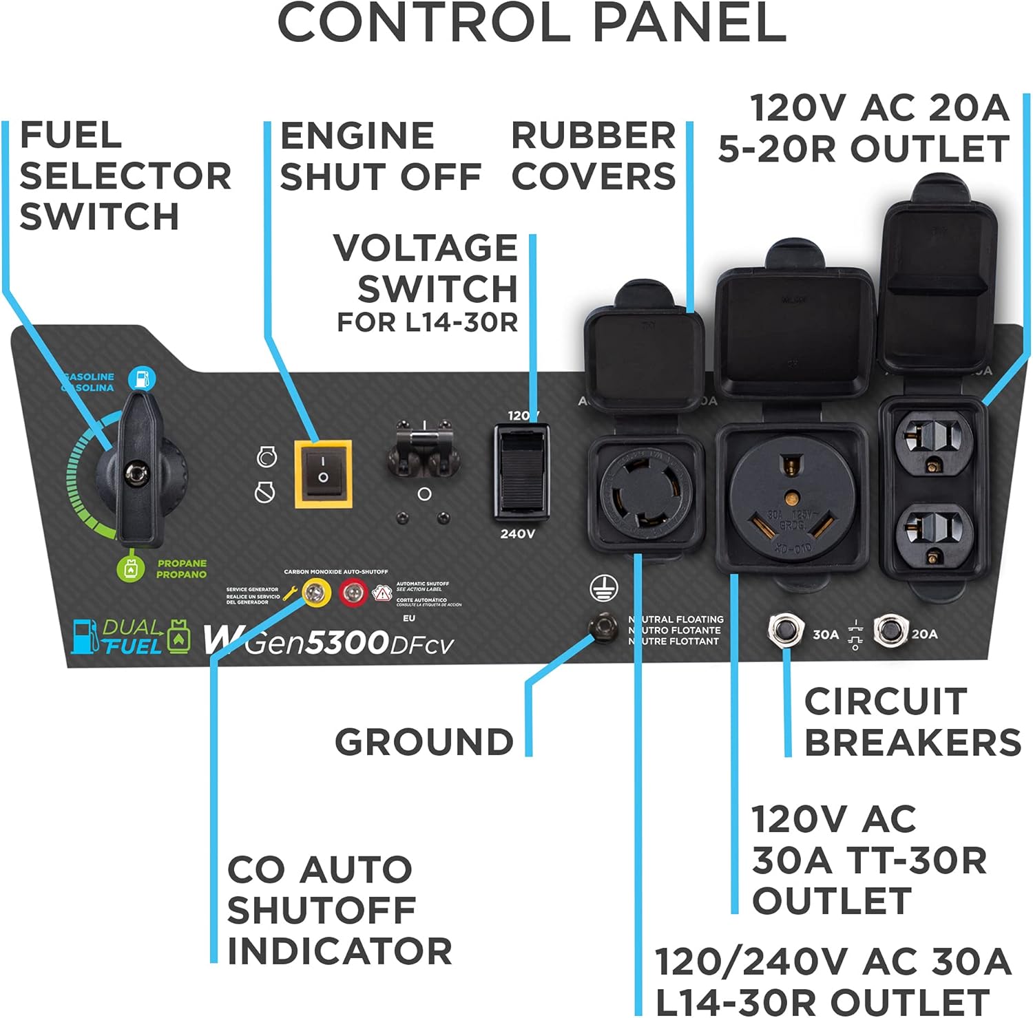 Features One 520R 120V 20V Household Duplex Receptacle One RV-Ready TT-30R 30A Receptacle and One Transfer Switch Ready L14-30R 30A Receptacle; All Outlets Have Rubber Covers for Added Safety