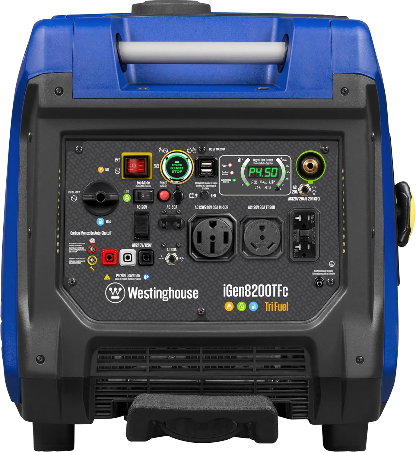DURABLE ENGINE WITH SAFETY BUILT-IN: Powered by a heavy duty 298 cc 4-stroke OHV engine with a cast iron sleeve; up to 17 hours of run time on a 3.9 gallon fuel tank at 25% load with automatic low oil shutdown and carbon monoxide (CO) sensor