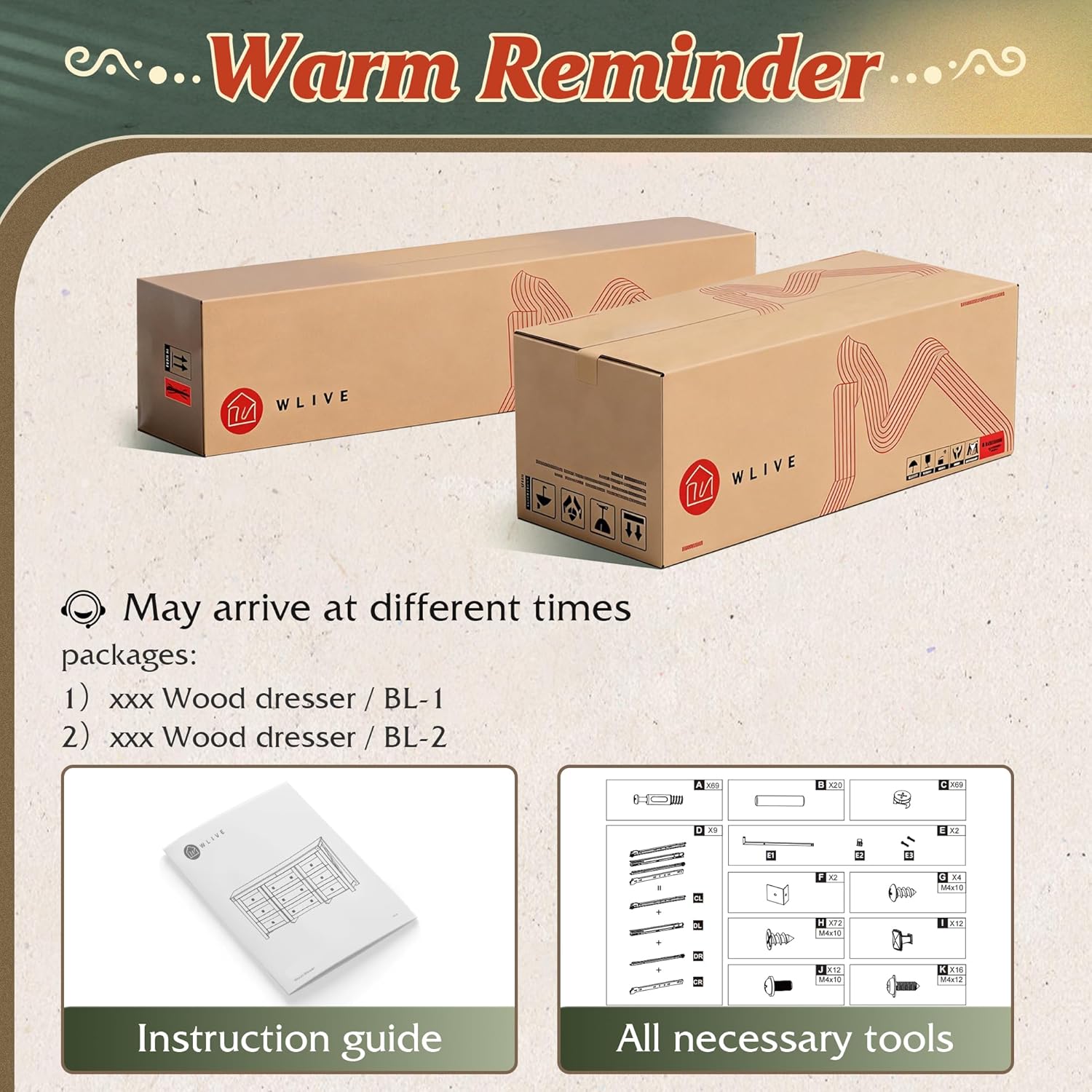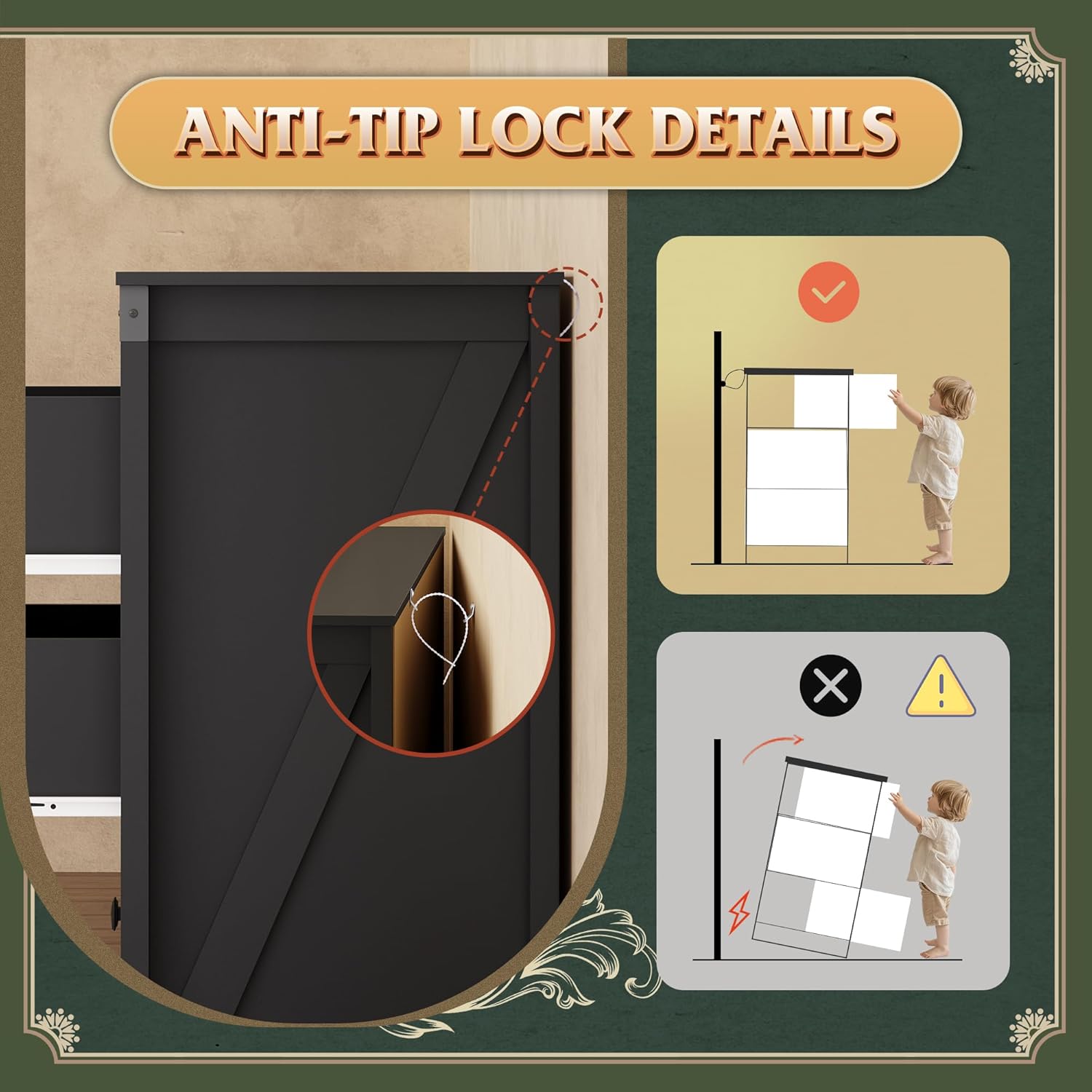 SAFE AND STURDY: The bedroom dresser is crafted from durable engineered wood, ensuring long-term use and scratch resistance. Each large wood drawer can hold up to 22lbs, each medium wood drawer can hold up to 16lbs, and the wood tabletop can hold up to 155lbs. Equipped with an anti-tipping device, effectively preventing shaking or tipping over, keeping family members and pets safe.