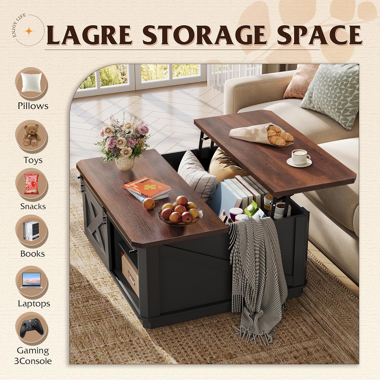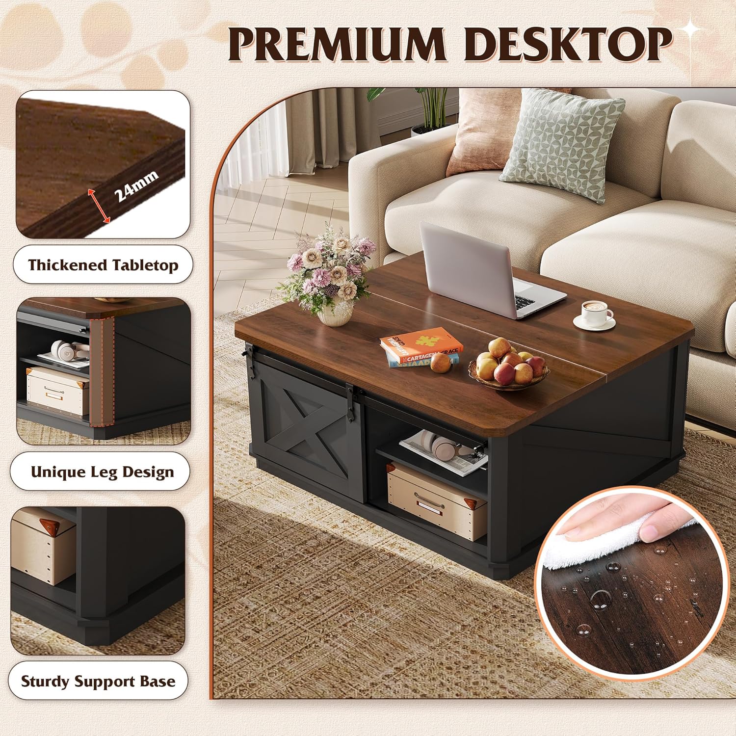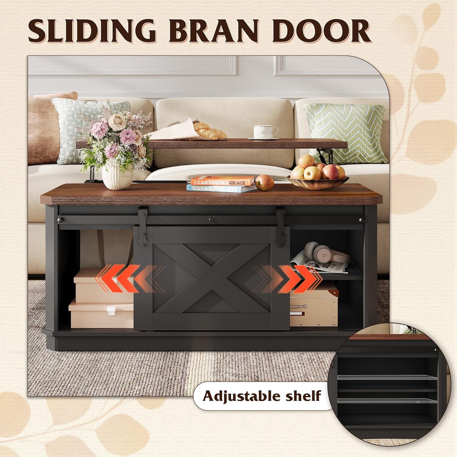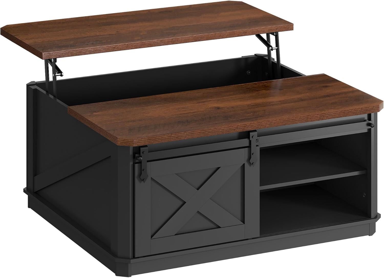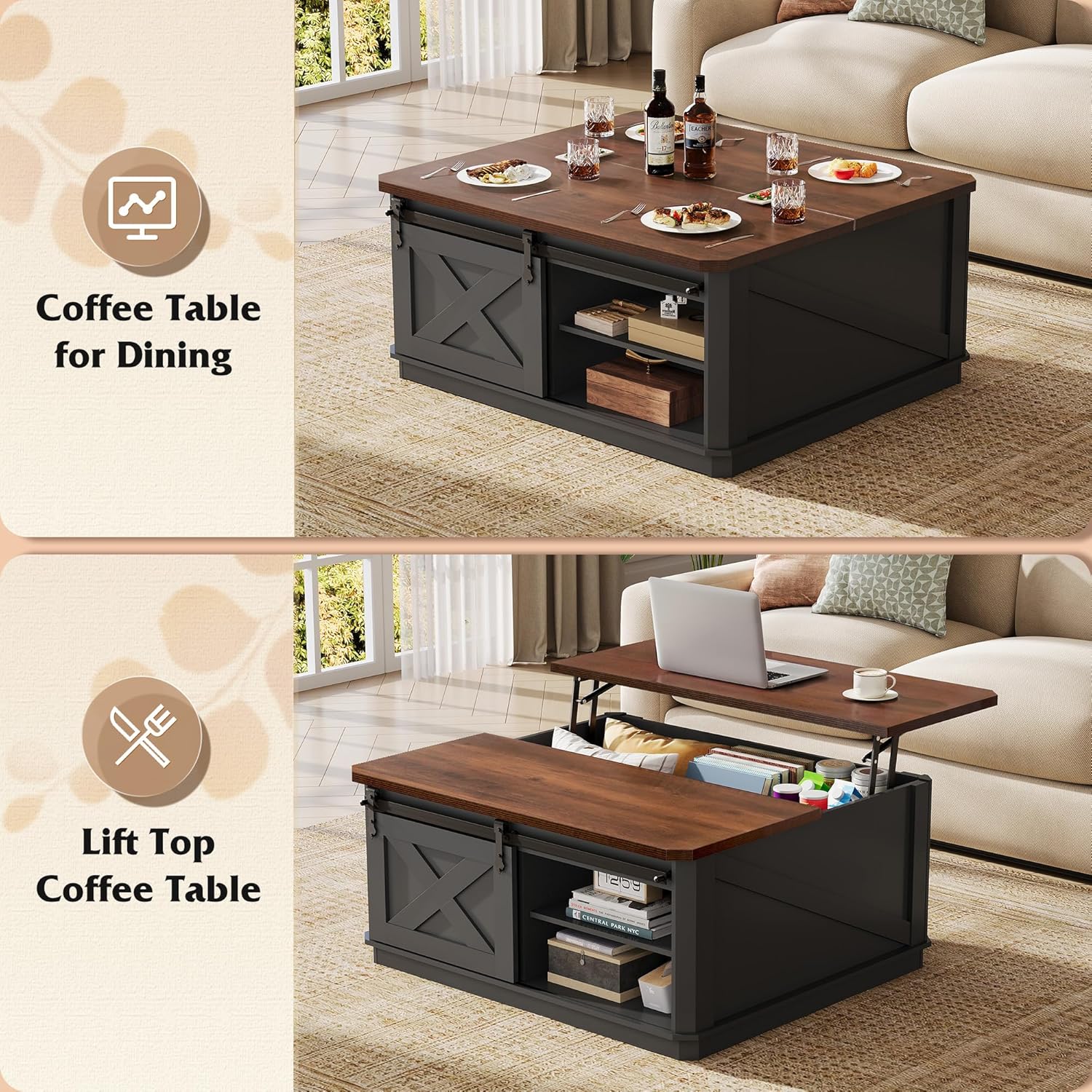 Elegant Farmhouse Design This versatile square storage coffee table blends charming barn doors with an elegant base, in crisp balck and warm brown, creating a cozy farmhouse charm. Perfect as a lift up coffee table, cocktail station, or casual dining surface, it brings modern rustic warmth to your living space
