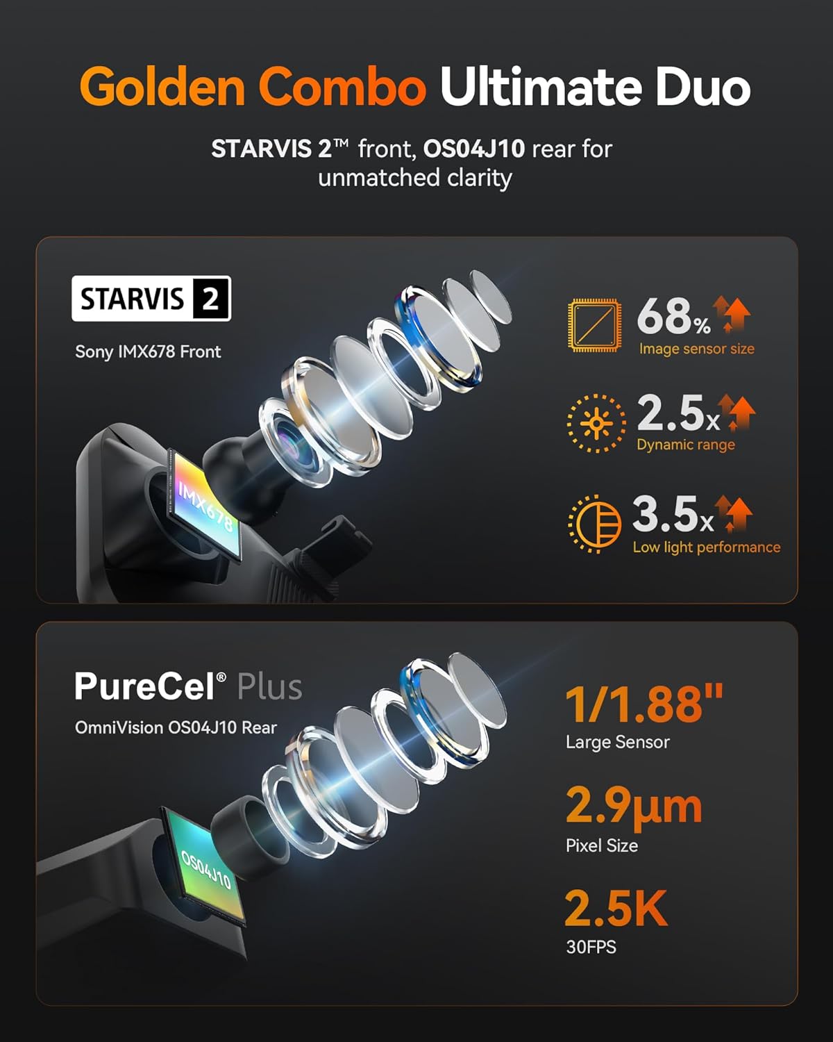 [4K Triple Channel Camera] This rearview mirror camera records in 4K front 2.5K rear and 1080P interior for comprehensive coverage. The rear camera features a 1/1.88-inch large sensor delivering superior light sensitivity with a 2.9m pixel size. It supports 2.5K 2560*1440 resolution at 30FPS Purecel Plus Technology enhances night vision setting a new standard for visibility in the dark