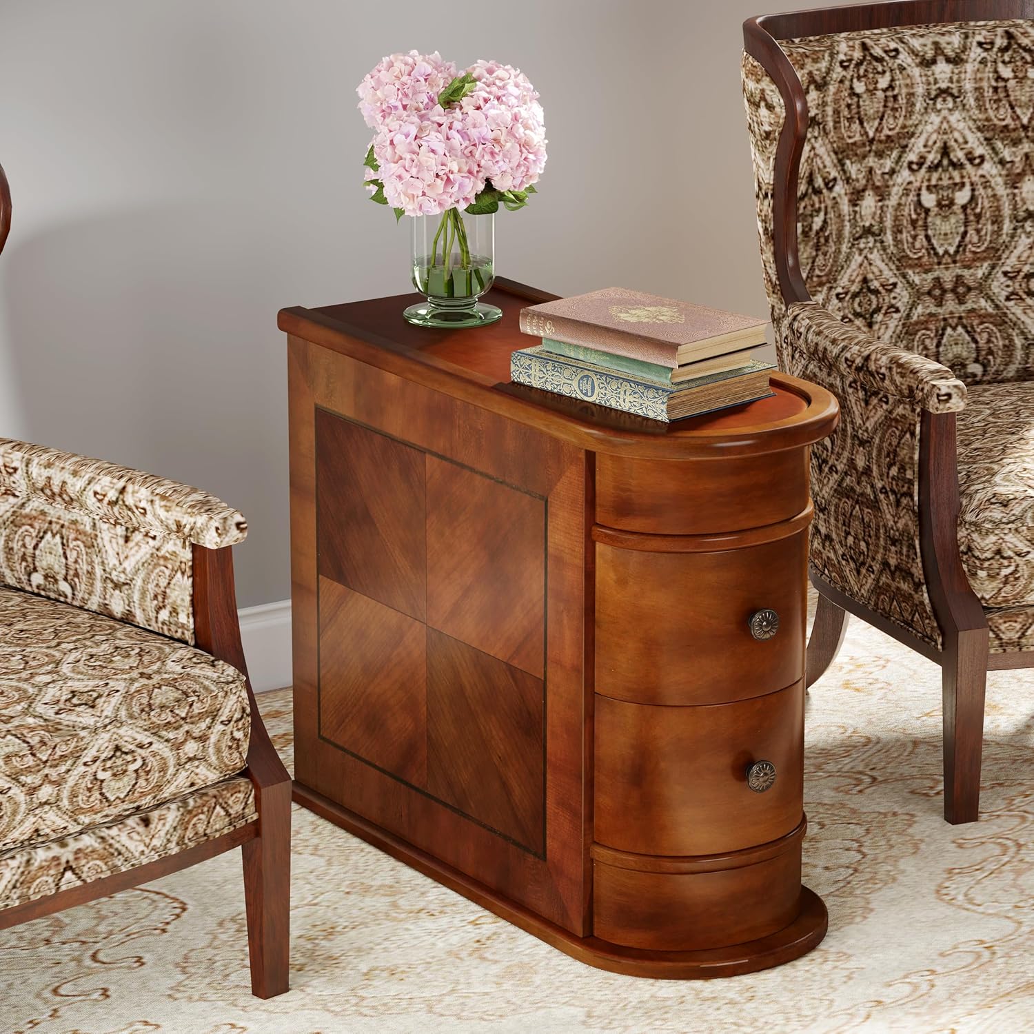 AMPLE and EFFCIENT STORAGE: Tabletop surface and two deep drawers provide ample and efficient storage. Smooth nickel drawer knob on the pull-out drawer allows for easy access to entertainment essentials.