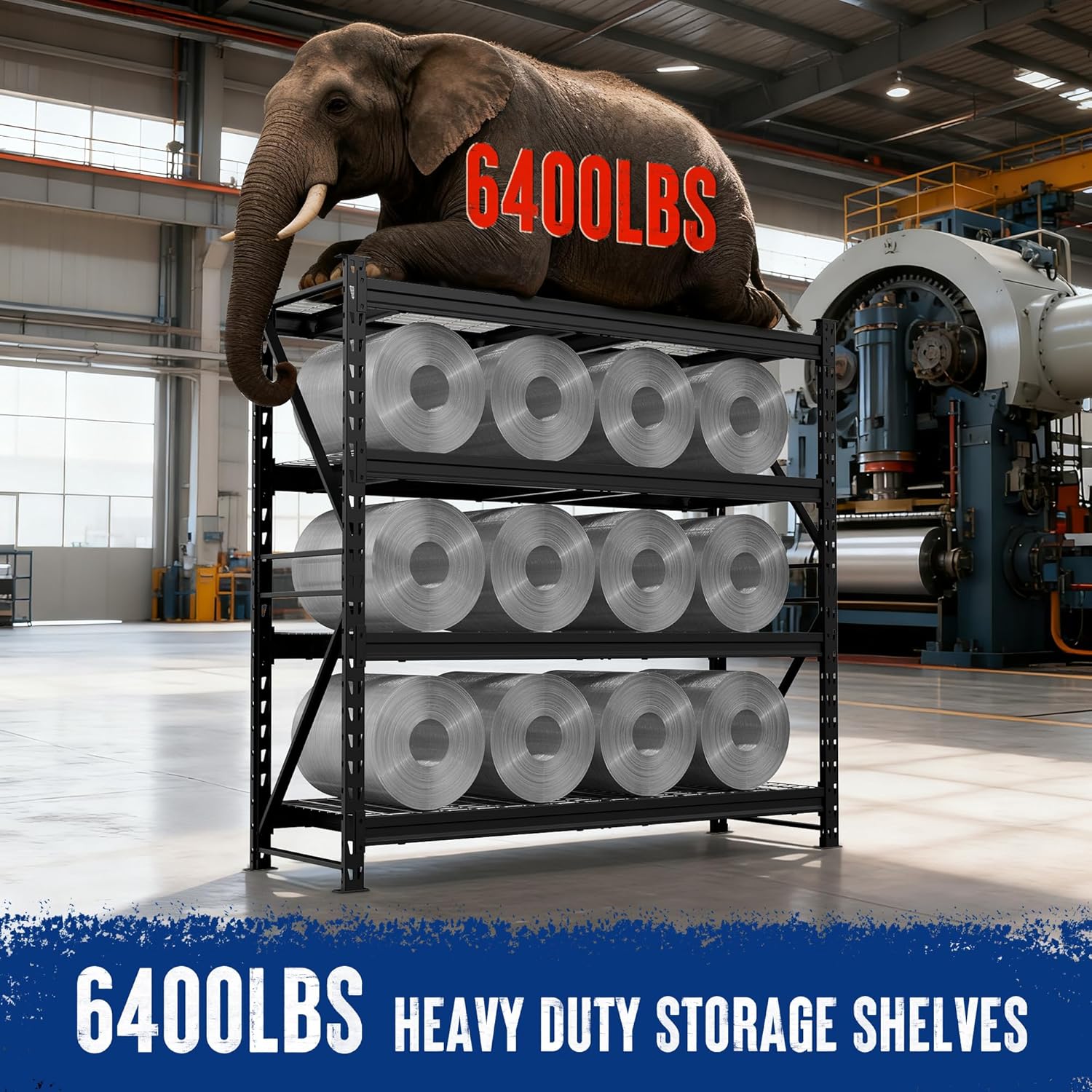 • 77" Extra-Width Garage Shelving Units, 6400LBS Heavy Duty Utility Shelves, 4 Tier Industrial Adjustable Metal Storage Rack for Warehouse Shop Basement Organizers, 77W x 24D x 72H