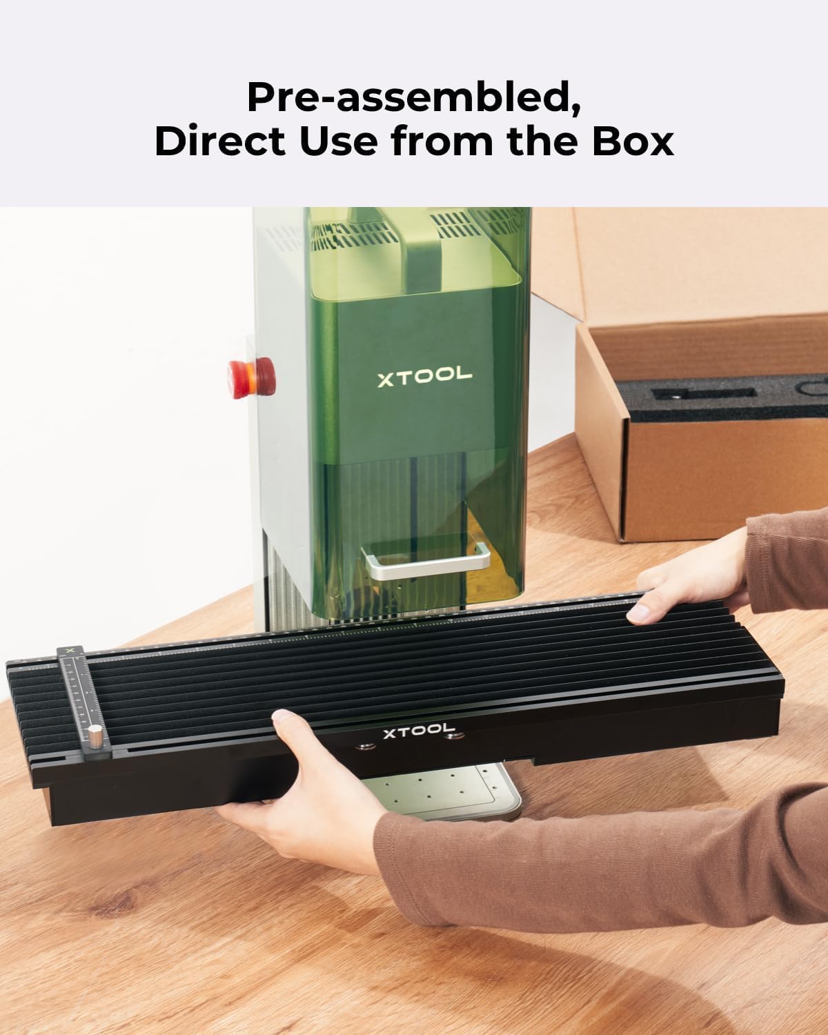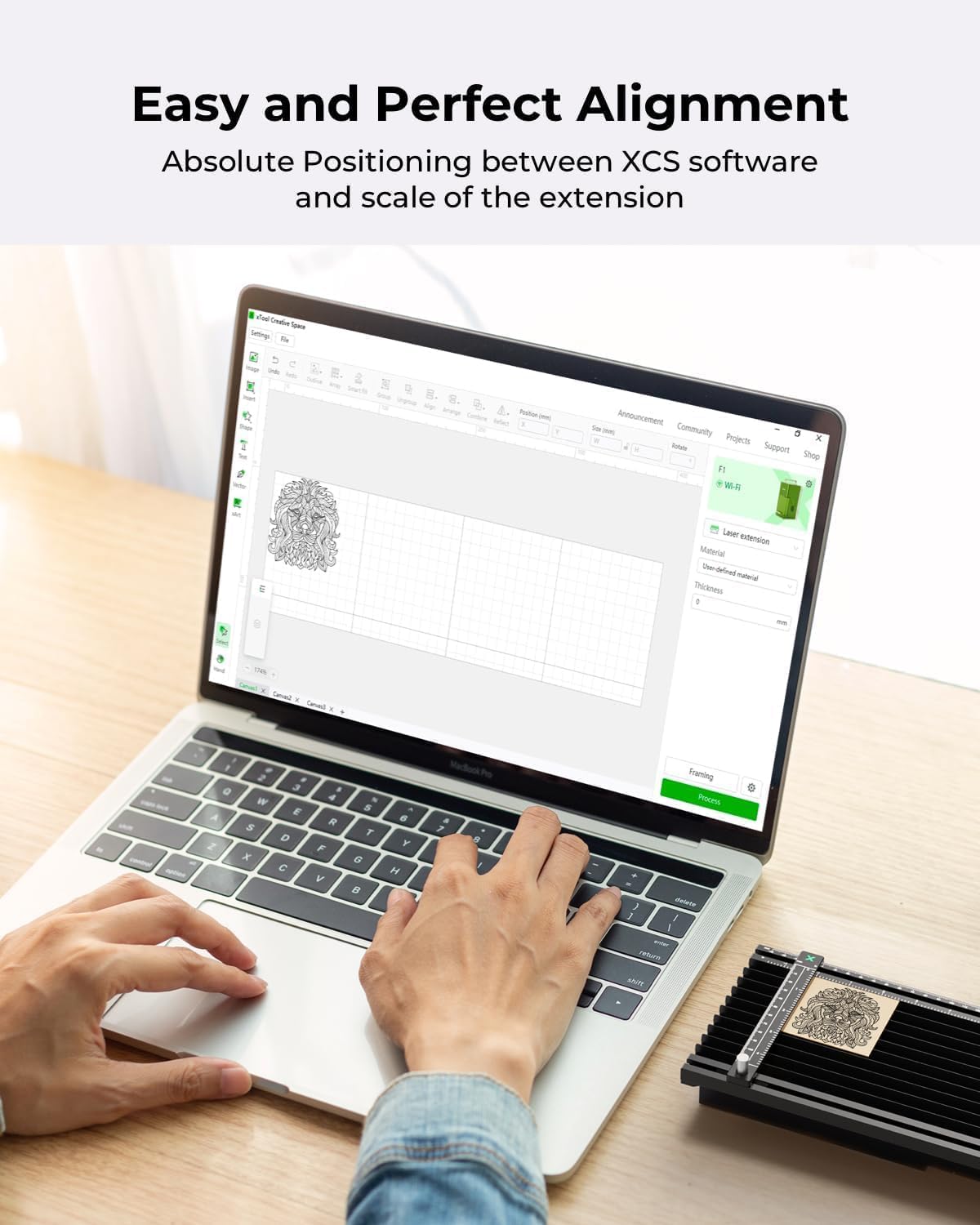 [Easy Focus Perfect Alignment Smart Framing] Scale rulers with two metrics assist in the placement of materials with the support of XCS software. Same as using F1 manual/auto focus and outline/frame preview are applicable to slide extension as well.