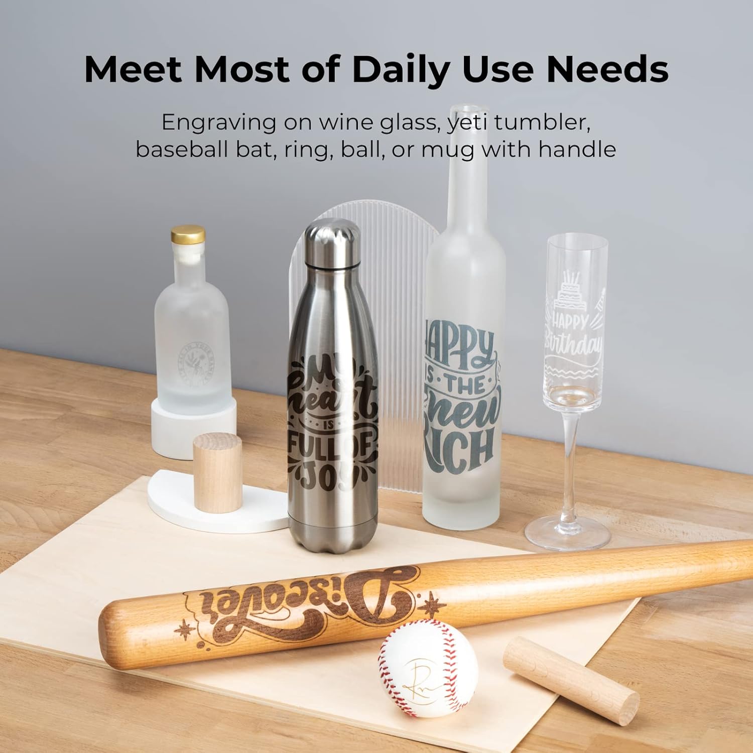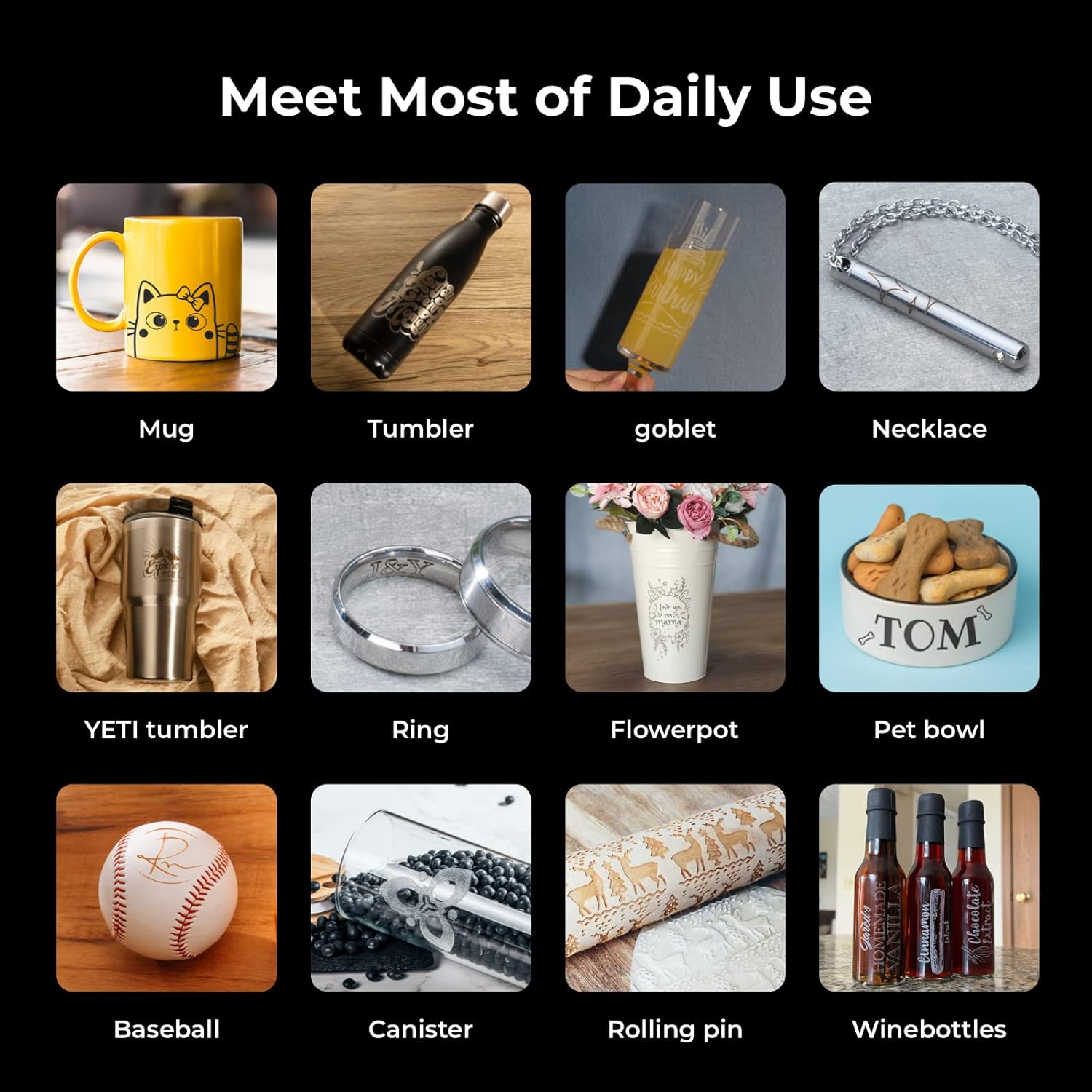 Stablly grabs the object the chuck rotary can engrave vector images on it quickly and accurately. Irregular cylinders like mugs with a handle wine glasses and YETI tumblers can also be engraved. The jaws provided can hold objects with a diameter between 0mm-100mm. To hold larger objects you can always 3D print your own jaws.